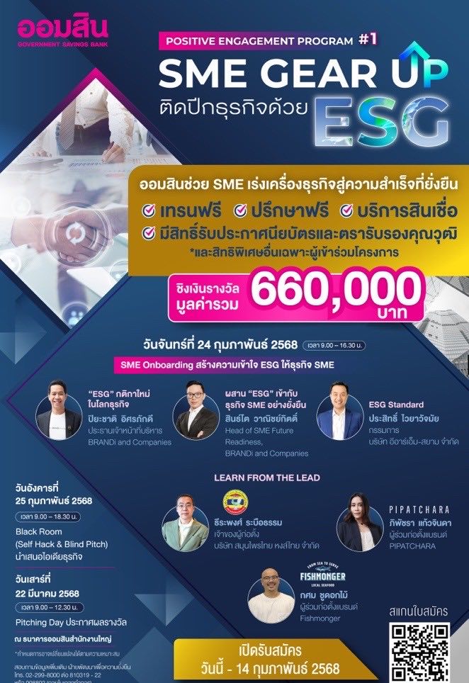 กิจกรรม SME Gear Up ติดปีกธุรกิจด้วย ESG เปิดให้ผู้ประกอบการ SME ที่ดำเนินงานสอดคล้องหรือมีศักยภาพในการพัฒนาธุรกิจโดยใช้แนวคิด ESG สมัครเข้าร่วมโครงการฯ สำหรับลูกค้าสินเชื่อธุรกิจ SME ของธนาคารออมสิน มีวงเงินสินเชื่อตั้งแต่ 50 – 250 ล้านบาท สำหรับผู้ประกอบการ SME ทั่วไป มีรายได้รวม 100 - 500 ล้านบาทต่อปี โดยผู้ประกอบการ SME ที่สมัครและผ่านการคัดเลือกในรอบแรก จะได้เข้าร่วมกิจกรรม SME Onboarding การอบรมให้ความรู้ ความเข้าใจในประเด็น ESG ผ่านมุมมองของธุรกิจ การศึกษา ESG Standard ตลอดจนการรับฟังกรณีศึกษาจากผู้ประกอบการ SME ต้นแบบ (Learn from the lead) ที่มีการดำเนินงานด้าน ESG อย่างเป็นรูปธรรมจนประสบความสำเร็จ และการนำเสนอไอเดียธุรกิจ เพื่อเฟ้นหาสุดยอดไอเดียธุรกิจ SME ลุ้นรับเงินรางวัลรวมมูลค่า 660,000 บาท โดยผู้ประกอบการ SME ที่ร่วมโครงการ ยังจะได้รับสิทธิพิเศษในการทำธุรกรรม/ยื่นสินเชื่อกับธนาคาร พร้อมรับประกาศนียบัตร ตรารับรองคุณวุฒิ และสิทธิพิเศษอื่น ๆ
