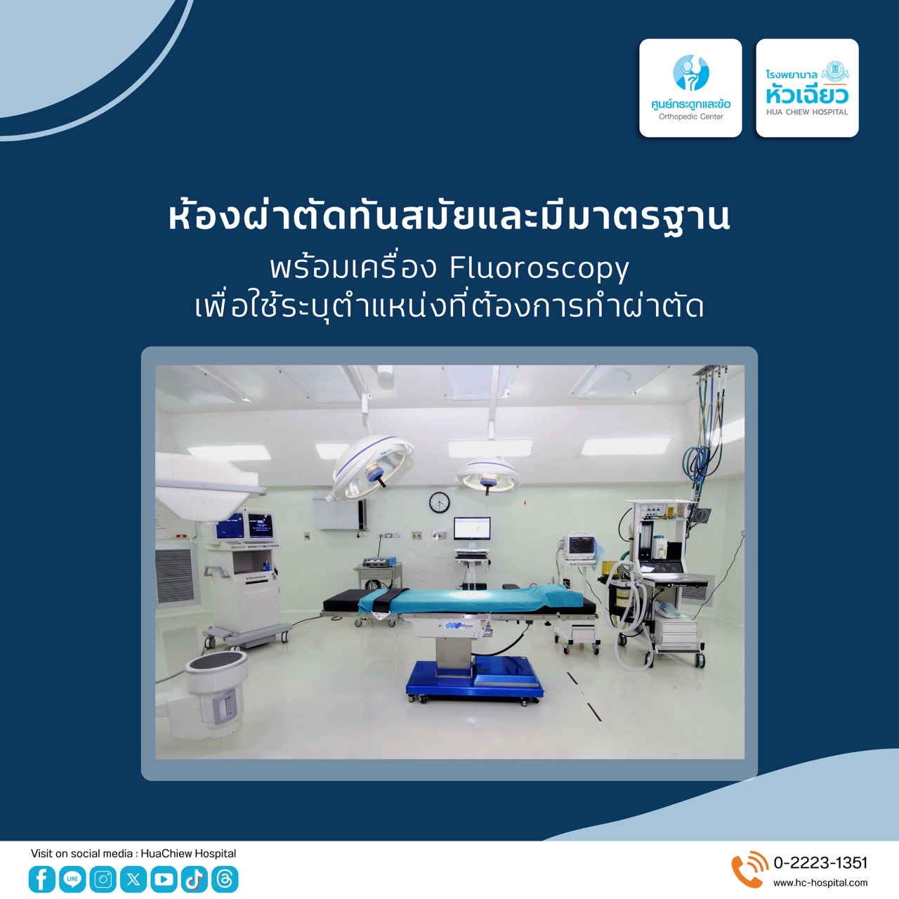 ศูนย์กระดูกและข้อ โรงพยาบาลหัวเฉียว มีศัลย์แพทย์เฉพาะทางกระดูกและข้อผู้ชำนาญการ ให้การดูแลรักษา สามารถวินิจฉัยและรักษาโรคกระดูกและข้อ และเส้นเอ็น รวมถึงภาวะกระดูกพรุน รักษาการผ่าตัดได้ทั้งแบบเปิดและส่องกล้อง รองรับด้วยห้องผ่าตัดที่มีมาตรฐานสูง พร้อมด้วยเครื่องมือภายในห้องผ่าตัดที่ทันสมัย อาทิ เครื่อง Fluoroscopy ในห้องผ่าตัด เพื่อใช้สำหรับระบุตำแหน่งที่ต้องการทำผ่าตัด ตรวจสอบความถูกต้องในระหว่างการผ่าตัดและหลังการผ่าตัด นอกจากนี้ยังช่วยเพิ่มมุมมองในการผ่าตัดให้ชัดเจนขึ้น เพื่อให้ผู้ป่วยหายจากความเจ็บปวด สามารถกลับไปใช้ชีวิตประจำวันอย่างมีคุณภาพชีวิตที่ดีเหมือนเดิม