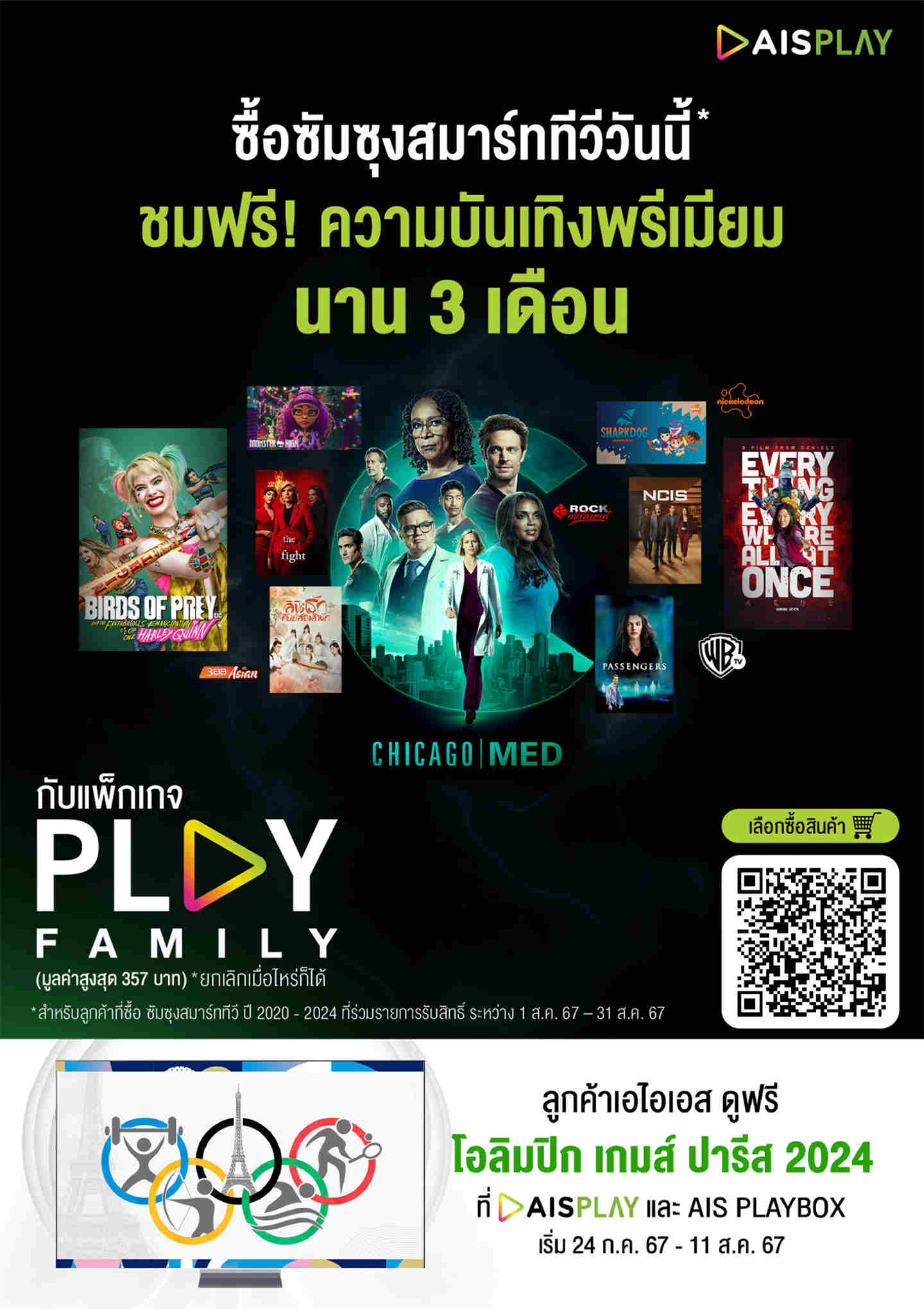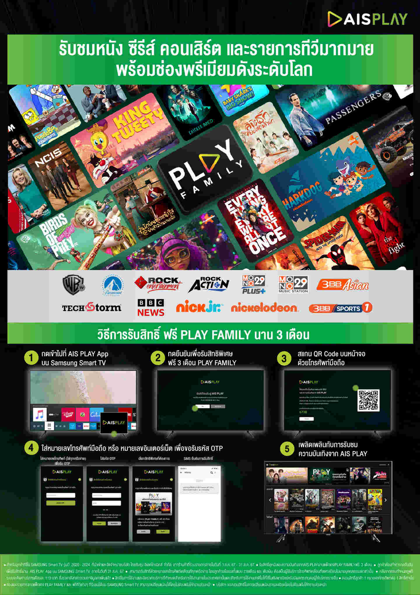 ซัมซุง ผู้นำเทคโนโลยีและนวัตกรรมระดับโลก ชวนเปิดประสบการณ์ความบันเทิงระดับพรีเมียมจาก AIS PLAY ไปกับซัมซุงสมาร์ททีวี ที่ผสานความบันเทิงทุกระดับเข้ากับนวัตกรรมภาพและเสียงชั้นเยี่ยม มาพร้อมฟีเจอร์อัจฉริยะ ที่มอบความสมจริงทุกรายละเอียด และความคมชัดเหนือจินตนาการทำให้ทุกฉากมีชีวิตชีวาราวกับอยู่ในเหตุการณ์จริง พร้อมรับสิทธิ์ชมฟรี AIS PLAY FAMILY นานถึง 3 เดือน เมื่อซื้อซัมซุงสมาร์ททีวีตั้งแต่วันนี้ ถึง 31 สิงหาคมนี้*