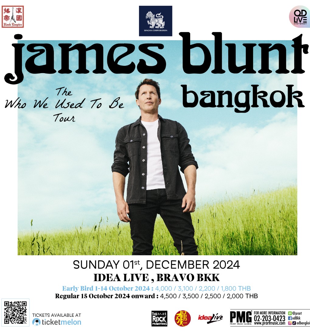 ได้เวลาที่แฟนเพลงชาวไทยที่รักและหลงใหลทั้งเสียงร้องและเมโลดี้ที่โคตรเพราะจะได้ร่วมกันต้อนรับการมาเยือนเมืองไทยของ James Blunt ศิลปินชาวอังกฤษ เจ้าของ “You’re Beautiful” บทเพลงสุดฮิตที่ได้รับการตอบรับจากคนฟังเพลงทั่วโลก กับโชว์ครั้งพิเศษที่ประเทศไทยหลังเว้นช่วง 13 ปี ใน “James Blunt The Who We Used To Be Tour Live in Bangkok 2024” ที่ 1 ธันวาคม 2567 ณ Idea Live ชั้น 5 BRAVO, BKK