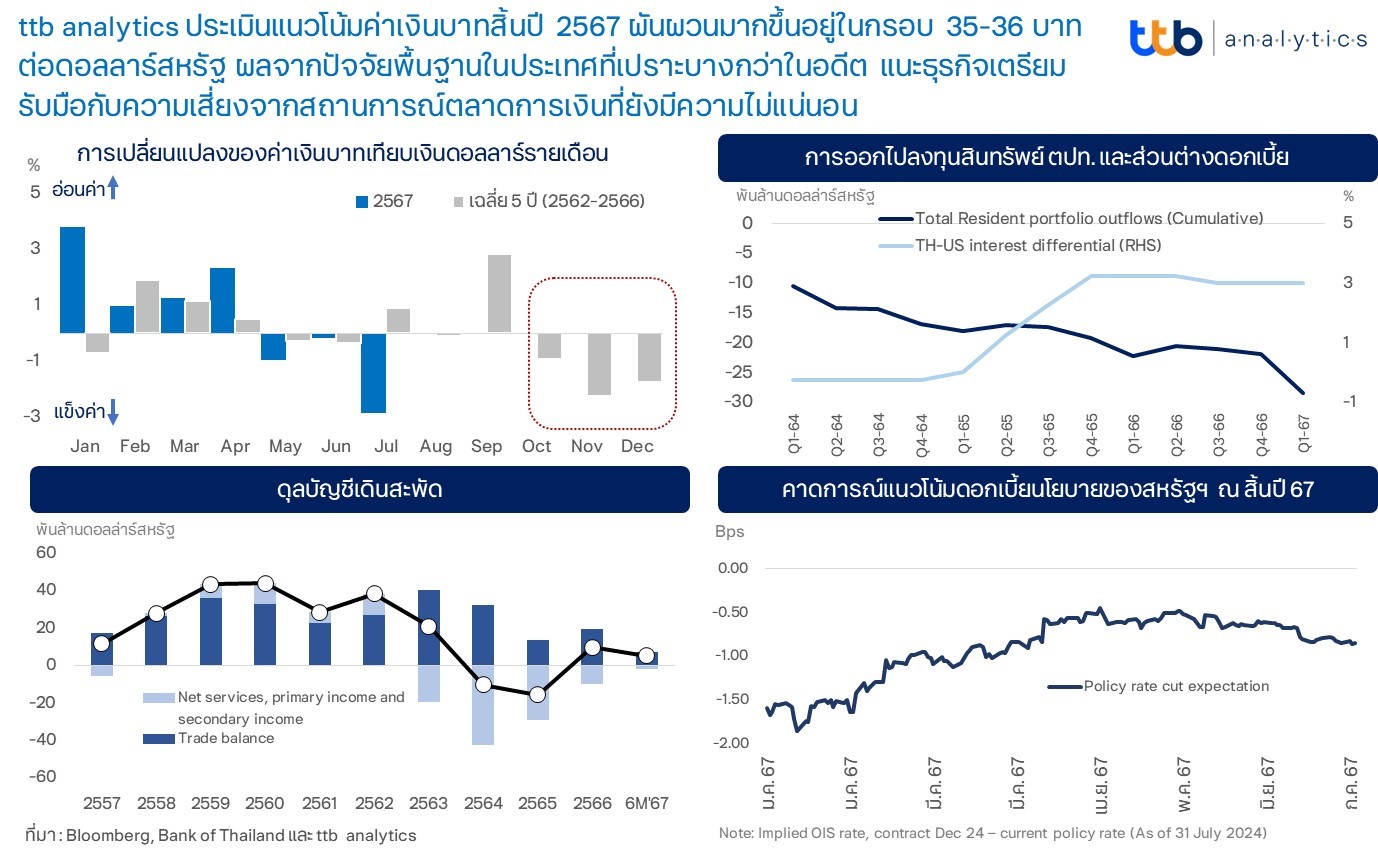 ศูนย์วิเคราะห์เศรษฐกิจ ทีทีบี หรือ ttb analytics ประเมินค่าเงินบาทในช่วงสิ้นปี 2567 มีแนวโน้มผันผวนมากขึ้น โดยจะอยู่ในกรอบ 35-36 บาทต่อดอลลาร์สหรัฐ เนื่องจากปัจจัยพื้นฐานภายในประเทศยังคงเปราะบางกว่าในอดีต หลังเศรษฐกิจไทยเผชิญกับปัญหาเชิงโครงสร้าง ซึ่งส่งผลให้ดุลการชำระเงินไม่แข็งแกร่งเหมือนในอดีต ประกอบกับความเสี่ยงจากปัญหาภูมิรัฐศาสตร์ที่ขยายตัว ทำให้ค่าเงินบาทยังมีความเสี่ยงอ่อนค่าและผันผวนอยู่ แม้ว่าเศรษฐกิจโลกจะเข้าสู่วัฏจักรดอกเบี้ยขาลงในช่วงปลายปีนี้ แนะธุรกิจเตรียมรับมือกับความเสี่ยงจากสถานการณ์ตลาดการเงินที่ยังมีความไม่แน่นอน
