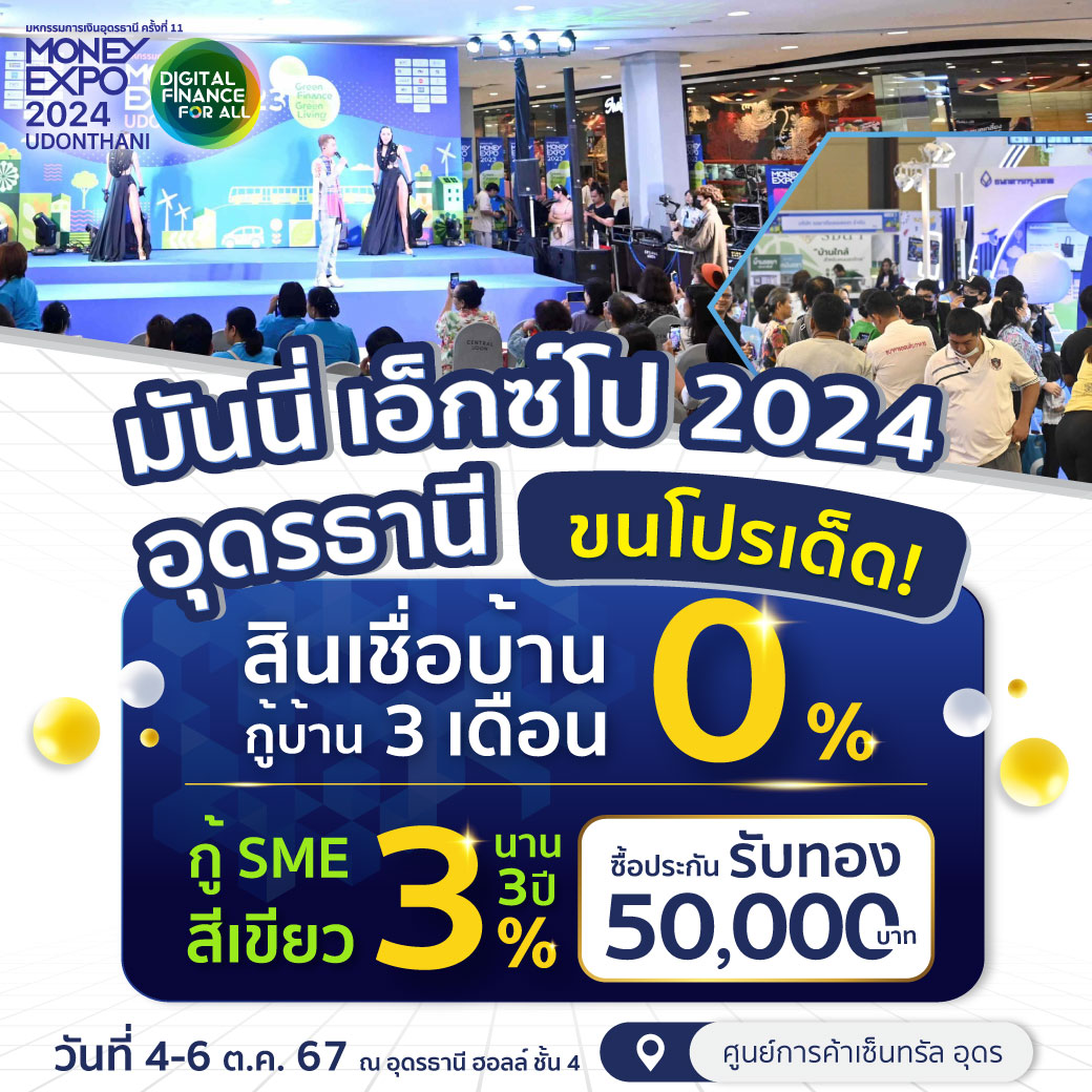 มันนี่ เอ็กซ์โป 2024 อุดรธานี ขนโปรเด็ด สินเชื่อบ้าน 0% 3 เดือน กู้ SME สีเขียว 3% นาน3 ปี ซื้อประกัน รับทอง 50,000 บาท