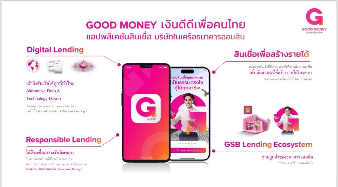 แพลตฟอร์ม GOOD MONEY - เงินดีดีเพื่อคนไทย นำเสนอผลิตภัณฑ์สินเชื่อรายย่อย 2 ประเภท ได้แก่ สินเชื่อส่วนบุคคล (Personal Loan) และ Nano Finance สำหรับผู้ที่ต้องการเงินทุนหมุนเวียนในการประกอบอาชีพหรือดำเนินธุรกิจ โดยมุ่งเน้นการสร้างหนี้ที่ก่อให้เกิดรายได้ (Productive Loan) ด้วยอัตราดอกเบี้ยที่เป็นธรรม เริ่มต้นที่ 19% ต่อปี นอกจากนี้ ยังให้ความสำคัญกับการปล่อยสินเชื่ออย่างรับผิดชอบ โดยใช้ระบบการประเมินคุณสมบัติผู้ขอกู้ที่พิจารณาจากอัตราส่วนภาระการชำระหนี้ต่อรายได้ (DSR) และอัตราดอกเบี้ยตามความเสี่ยง (Risk-Based Pricing) เพื่อให้มั่นใจว่าลูกค้ามีความสามารถในการชำระหนี้ได้โดยไม่เกิดปัญหาหนี้เกินตัว ที่สำคัญลูกค้าที่มีประวัติการชำระหนี้ดีอย่างต่อเนื่องจะมีโอกาสได้รับอัตราดอกเบี้ยที่ต่ำลง ซึ่งเป็นการส่งเสริมวินัยทางการเงินที่ดี และเปิดโอกาสให้ลูกค้าสามารถพัฒนาไปสู่การใช้บริการสินเชื่อของธนาคารออมสินในอนาคต ผู้ที่สนใจสามารถดาวน์โหลดแอปพลิเคชัน Good Money by GSB ได้แล้ว ทั้งในระบบ iOS และ Android โดยลูกค้าธนาคารออมสินสามารถยืนยันตัวตนผ่านแอปพลิเคชัน MyMo ส่วนลูกค้าทั่วไปสามารถยืนยันตัวตนด้วยบัตรประชาชนที่สาขาธนาคารออมสิน ทั่วประเทศ ติดตามรายละเอียดที่ https://goodmoneybygsb.com/ หรือดาวน์โหลดแอปพลิเคชันที่ https://goodmoneybygsb.go.link/64pm7