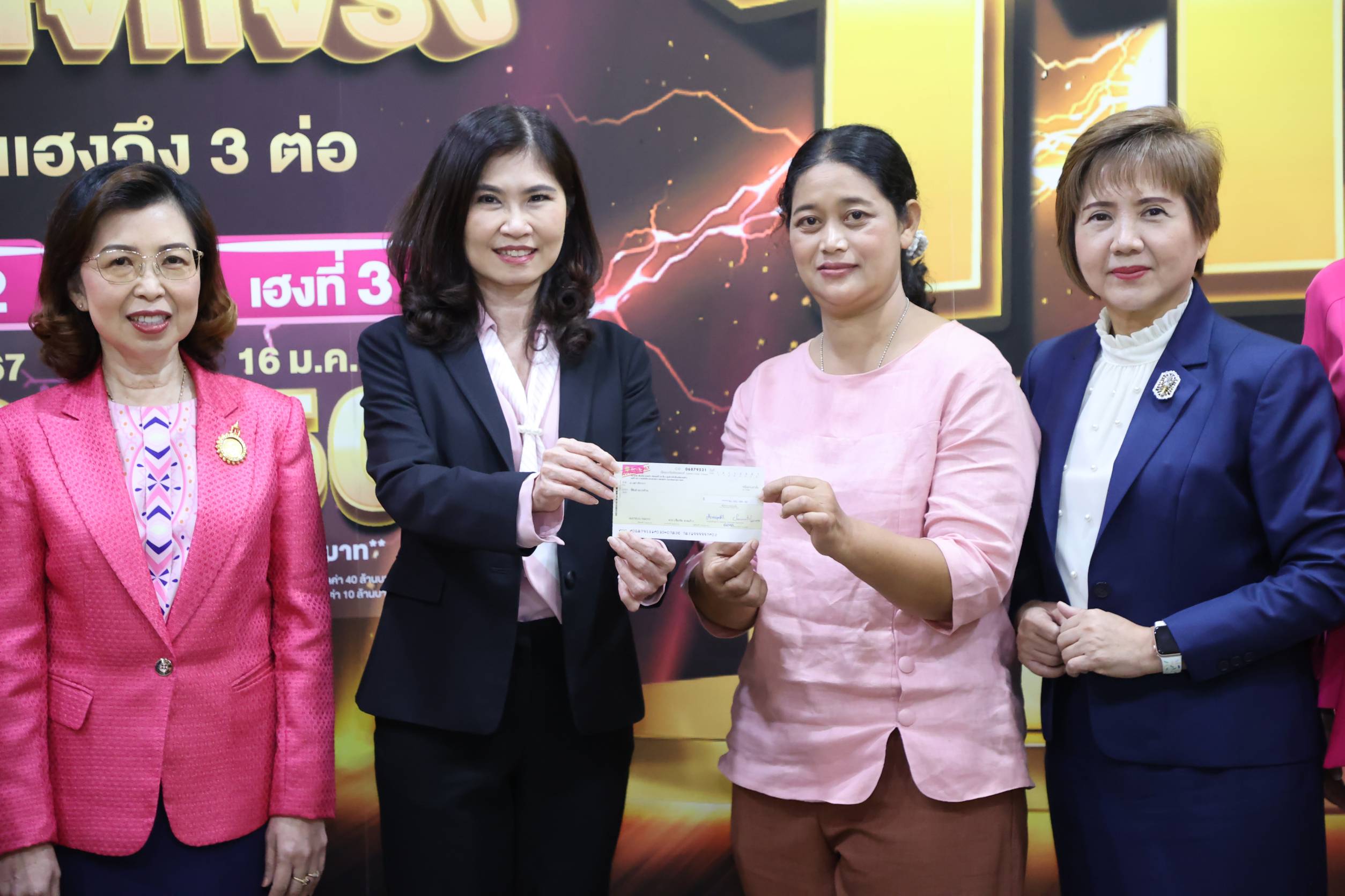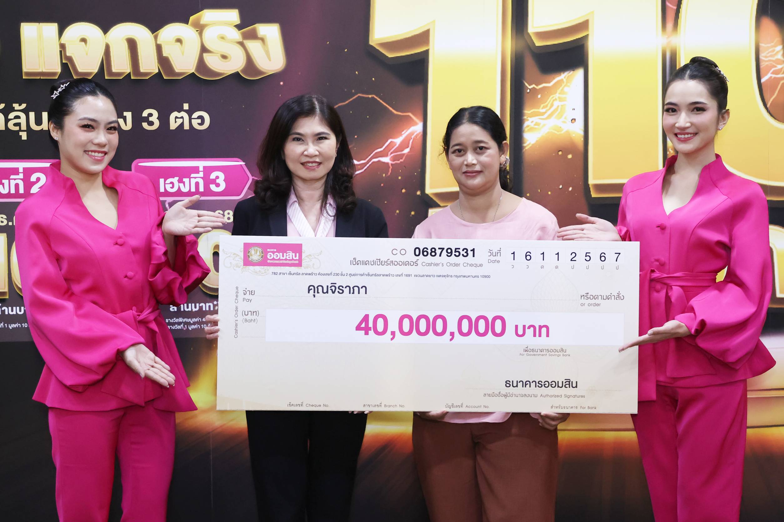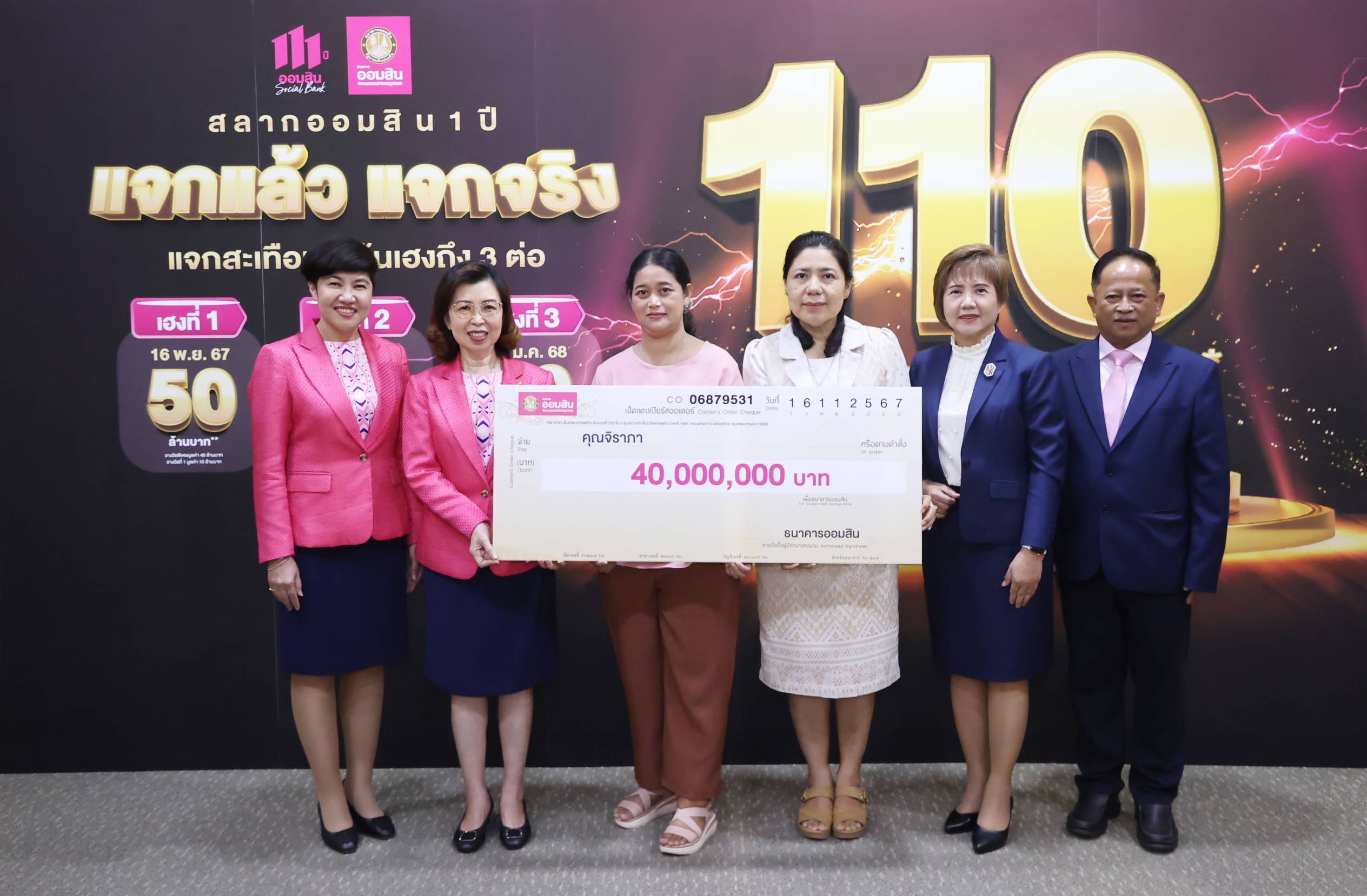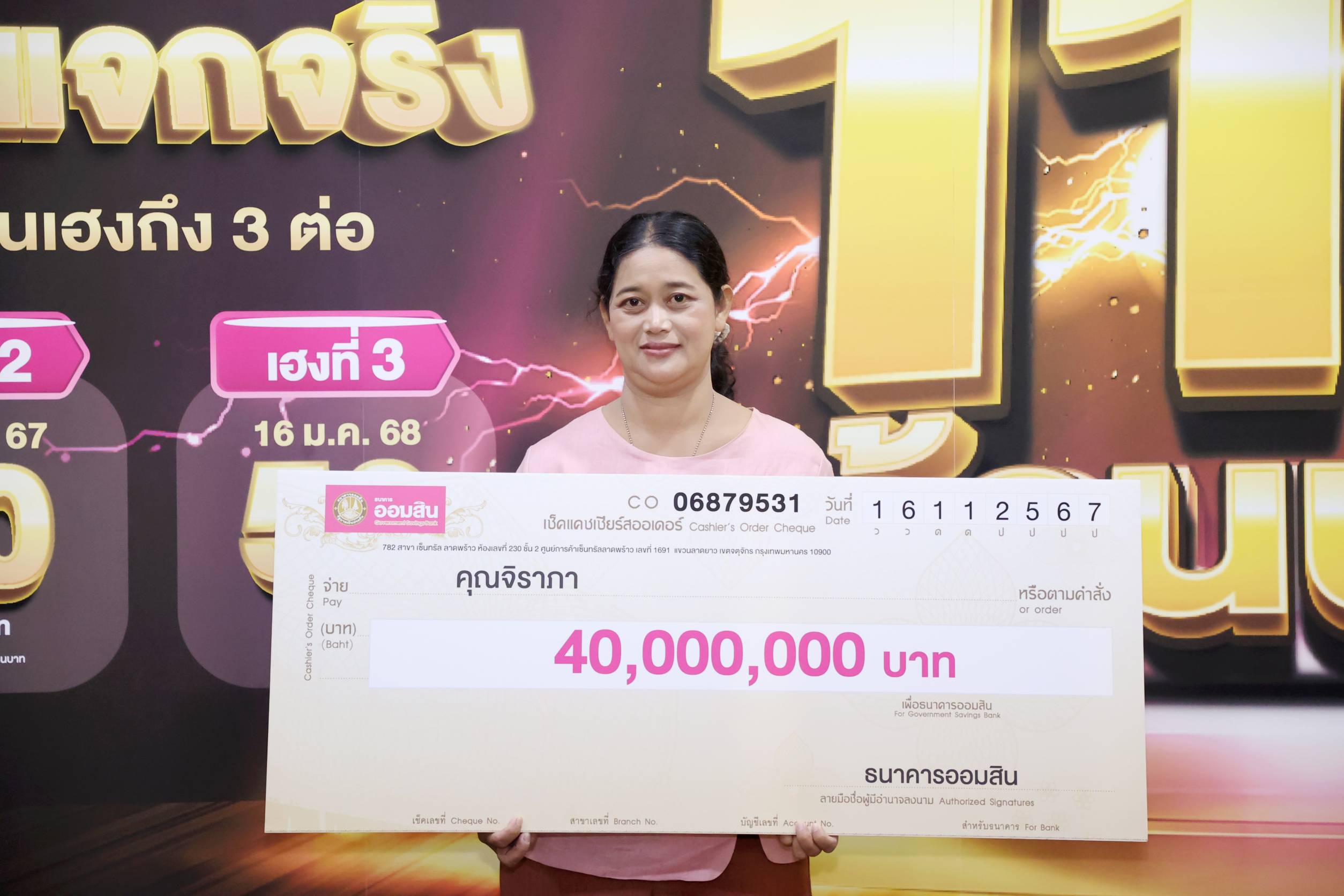 นางสาวศิริพร เลิศสัตยสุกใส รองผู้อำนวยการธนาคารออมสิน กลุ่มลูกค้าบุคคล มอบรางวัลพิเศษ 40 ล้านบาท ให้แก่ คุณจิราภา ลูกค้าธนาคารออมสิน สาขาท่าชนะ จังหวัดสุราษฎร์ธานี โดยเป็นผู้โชคดีจากการถูกรางวัลสลากออมสินพิเศษ 1 ปี งวดที่ 607 หมวดอักษร ศ หมายเลขสลาก 3552973 จากแคมเปญแจกสะเทือนได้ลุ้นเฮงถึง 3 ต่อ มูลค่ารวม 110 ล้านบาท ซึ่งมีการออกรางวัลเฮงที่ 1 ไปเมื่อวันที่ 16 พฤศจิกายน 2567 ที่ผ่านมา โดยมีผู้บริหารร่วมเป็นสักขีพยาน ณ ธนาคารออมสินสำนักงานใหญ่ เมื่อวันที่ 19 พฤศจิกายน 2567 สำหรับสลากออมสินพิเศษ 1 ปี หน่วยละ 100 บาท ไม่จำกัดวงเงินรับฝากสูงสุด เมื่อฝากครบกำหนด 1 ปี จะได้รับเงินต้นพร้อมดอกเบี้ยหน่วยละ 0.25 บาท นอกจากจะมีสิทธิ์ลุ้นรางวัลที่ 1 มูลค่า 10 ล้านบาท และรางวัลอื่น ๆ รวม 12 ครั้ง ยังมีสิทธิ์ลุ้นรางวัลพิเศษ มูลค่า 40 ล้านบาท อีก 1 งวด คือ งวดประจำวันที่ 16 มกราคม 2568 ผู้สนใจสามารถฝากสลากออมสินได้ที่ธนาคารออมสินทุกสาขาทั่วประเทศ และแอป MyMo