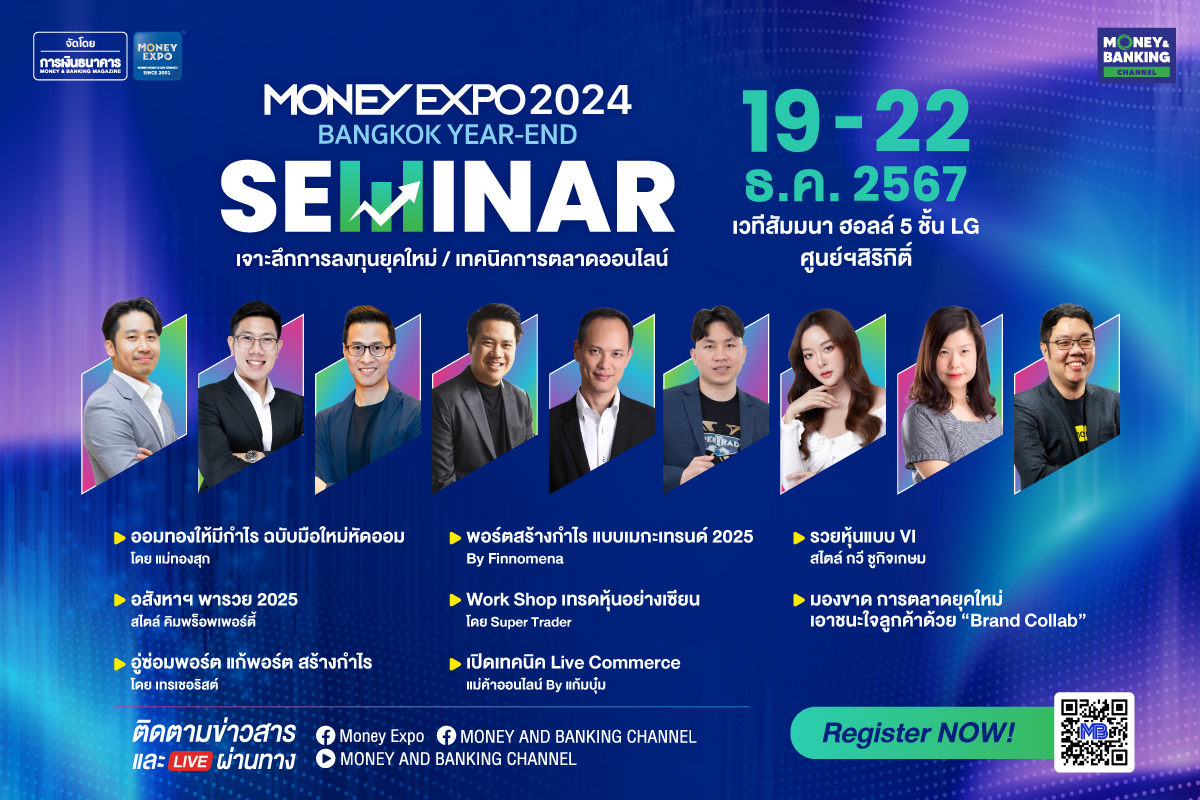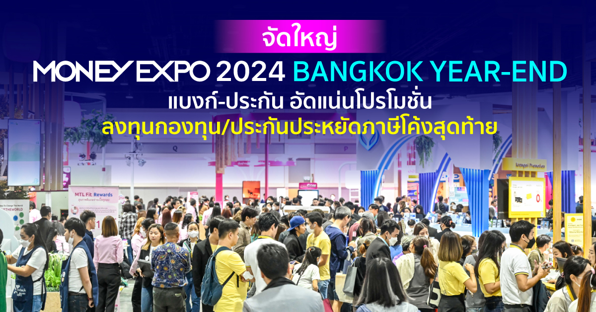 เตรียมพบกับอีเวนต์ทางการเงินสุดยิ่งใหญ่ส่งท้ายปีที่คุณไม่ควรพลาด! งานมหกรรมการเงินกรุงเทพส่งท้ายปี ครั้งที่ 7 MONEY EXPO 2024 BANGKOK YEAR-END แบงก์-นอนแบงก์-ประกัน-บล.-บลจ. ยกทัพบริการทางการเงินการลงทุนครบวงจร พร้อมอัดแน่นแคมเปญโปรโมชั่นสุดพิเศษส่งท้ายปี เงินกู้ดอกเบี้ยต่ำ เงินฝากดอกเบี้ยสูง โค้งสุดท้ายลงทุนกองทุน-ประกันลดหย่อนภาษี พร้อมฟังฟรี สัมมนาการลงทุนหุ้นจากกูรูและอินฟลูเอ็นเซอร์ชื่อดัง ในวันที่ 19-22 ธันวาคม 2567 ณ ฮอลล์ 5 ชั้น LG ศูนย์การประชุมแห่งชาติสิริกิติ์