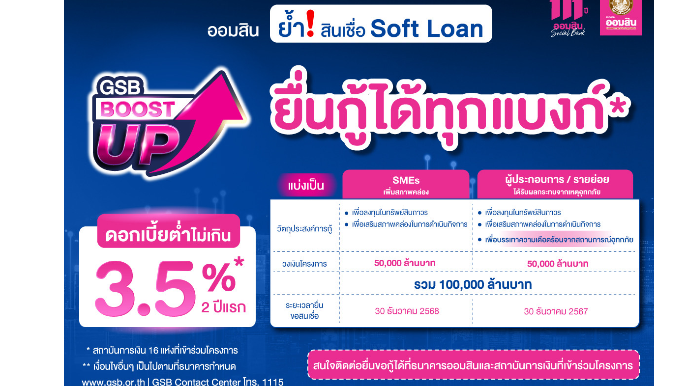 ออมสิน ย้ำ! สินเชื่อดอกเบี้ยต่ำ 3.5% สำหรับ SMEs และรายย่อย ยื่นกู้ได้ทุกแบงก์ ในโครงการ Soft Loan GSB Boost Up เพื่อการลงทุน และบรรเทาความเดือดร้อนจากเหตุอุทกภัย