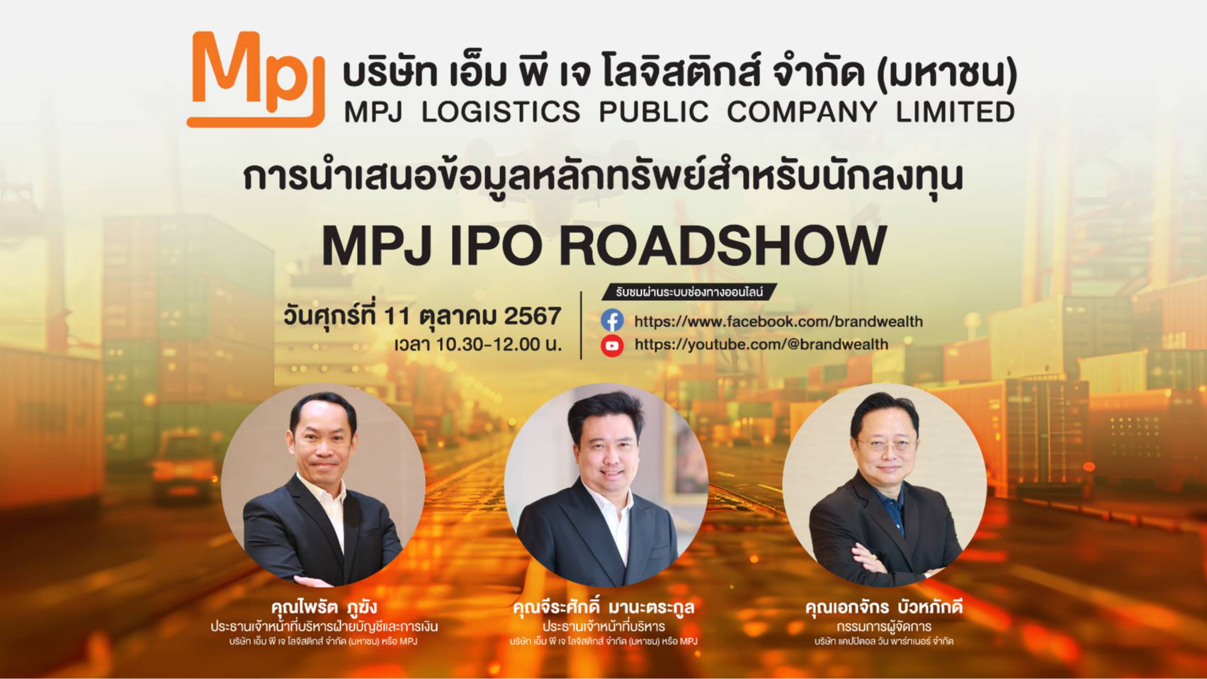 “MPJ” ผู้นำโลจิสติกส์แบบครบวงจร หุ้นโลจิสติกส์น้องใหม่ จัดโรดโชว์ศุกร์ 11 ตุลาคมนี้ เตรียมขาย IPO 53 ล้านหุ้น ปลายเดือนนี้
