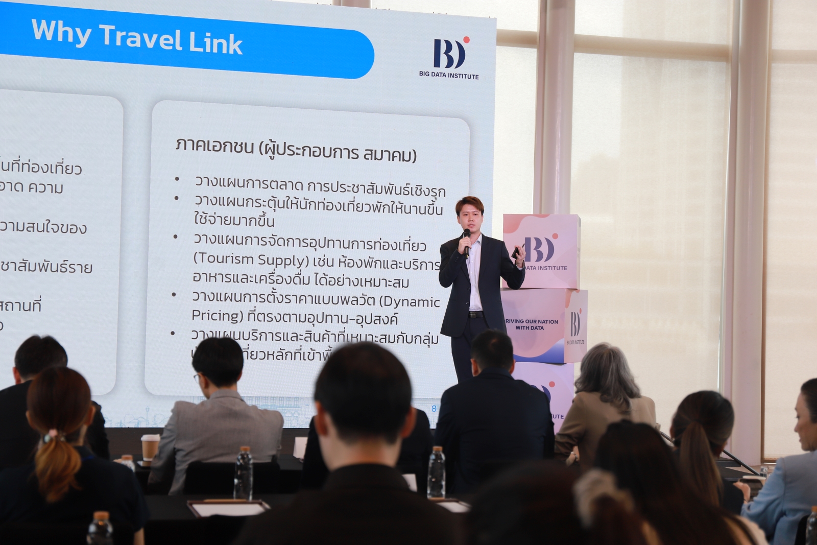 สถาบันข้อมูลขนาดใหญ่ (องค์การมหาชน) หรือ BDI โดยกระทรวงดิจิทัลเพื่อเศรษฐกิจและสังคม (ดีอี) เดินหน้าเสริมแกร่งผู้ประกอบการ SMEs ไทย จัดงานสัมมนา connect-the-dots #2: DATA-DRIVEN SUSTAINABILITY for Hospitality, Tourism and Manufacturing ปลดล็อกสู่ความยั่งยืนด้วยข้อมูล สำหรับธุรกิจโรงแรม ท่องเที่ยว และการผลิต พร้อมโชว์ 2 โปรเจกต์ คือ Travel Link และ Envi Link เพื่อส่งเสริมสนับสนุนผู้ประกอบการด้านการท่องเที่ยว ตามติดปัญหาด้านสิ่งแวดล้อม ด้วยนวัตกรรมเทคโนโลยี AI ชี้ช่องทางในการกำหนดกลยุทธ์ สู่นโยบายการขับเคลื่อนธุรกิจที่เป็นมิตรต่อสิ่งแวดล้อมเพื่อความยั่งยืนขององค์กร ยกระดับเทียบเท่ามาตรฐานสากล