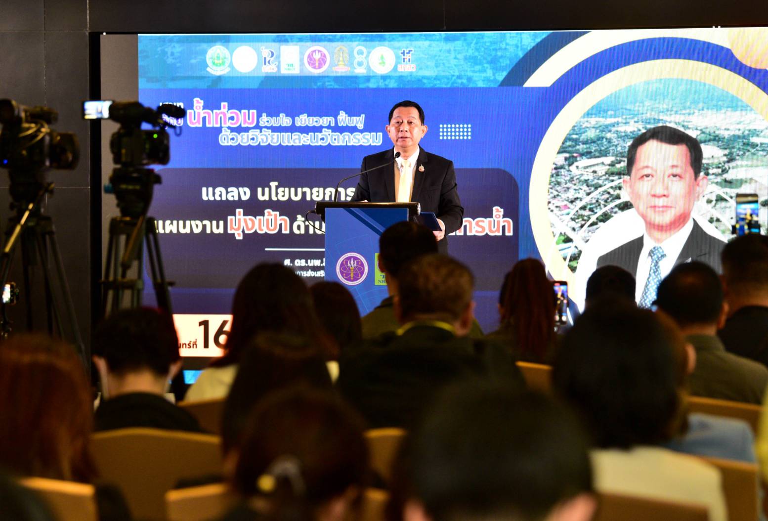 ศ. ดร.นพ.สิริฤกษ์ ทรงศิวิไล ประธานกรรมการส่งเสริมวิทยาศาสตร์ฯ กล่าวถึง การขับเคลื่อนแผนงานเป้าหมายของคณะกรรมการส่งเสริมวิทยาศาสตร์ วิจัยและนวัตกรรม (กสว.) ซึ่งแผนงานด้านการบริหารจัดการน้ำ เป็นหนึ่งในเป้าหมายสำคัญจากจำนวน 11 เป้าหมายสำคัญ ของ กสว. ซึ่งภัยพิบัติทางน้ำที่เกิดขึ้นในช่วงปลายเดือนสิงหาคมจนถึงกันยายนที่ผ่านมา และมีแนวโน้มไปถึงเดือนตุลาคม เป็นผลกระทบมาจากไต้ฝุ่นที่เกิดขึ้นในภูมิภาคนี้ ซึ่งเป็นเหตุการณ์ที่สร้างความเสียหายอย่างมากจากการเปลี่ยนแปลงของสภาพภูมิอากาศของโลก ที่สร้างการเปลี่ยนแปลงอย่างรวดเร็วและรุนแรงมากกว่าในอดีต โดยแผนงานด้านการบริหารจัดการน้ำประกอบด้วย keyword สำคัญ คือ ไม่ท่วม ไม่แล้ง มีน้ำดีใช้ ไม่มีน้ำเสีย กสว. จึงวางกลไกจัดการ ป้องกัน และช่วยเหลือปัญหาจากอุทกภัย ซึ่งแบ่งเป็น 3 ระยะ คือ ระยะสั้น ในการนำงานวิจัยที่สำเร็จแล้วไปใช้ทันทีในภาวะฉุกเฉินเพื่อป้องกันการสูญเสียชีวิต และทรัพย์สิน รวมถึงการฟื้นฟูโดยมีมหาวิทยาลัยในพื้นที่เป็นศูนย์กลางในการกระจายความช่วยเหลือ ระยะกลาง และระยะยาวคือการคาดการณ์เพื่อเตรียมพร้อมรับสถานการณ์ โดยกองทุนส่งเสริมวิทยาศาสตร์ วิจัยและนวัตกรรม (กองทุน ววน.) ทำหน้าที่ส่งเสริม สนับสนุนและขับเคลื่อนภาควิชาการ การวิจัยและนวัตกรรมมีประโยชน์ต่อประเทศ สามารถนำไปใช้ได้จริง และพร้อมรับการเปลี่ยนแปลงทั้งในเชิงประชากร การเปลี่ยนแปลงพฤติกรรม การใช้ทรัพยากร