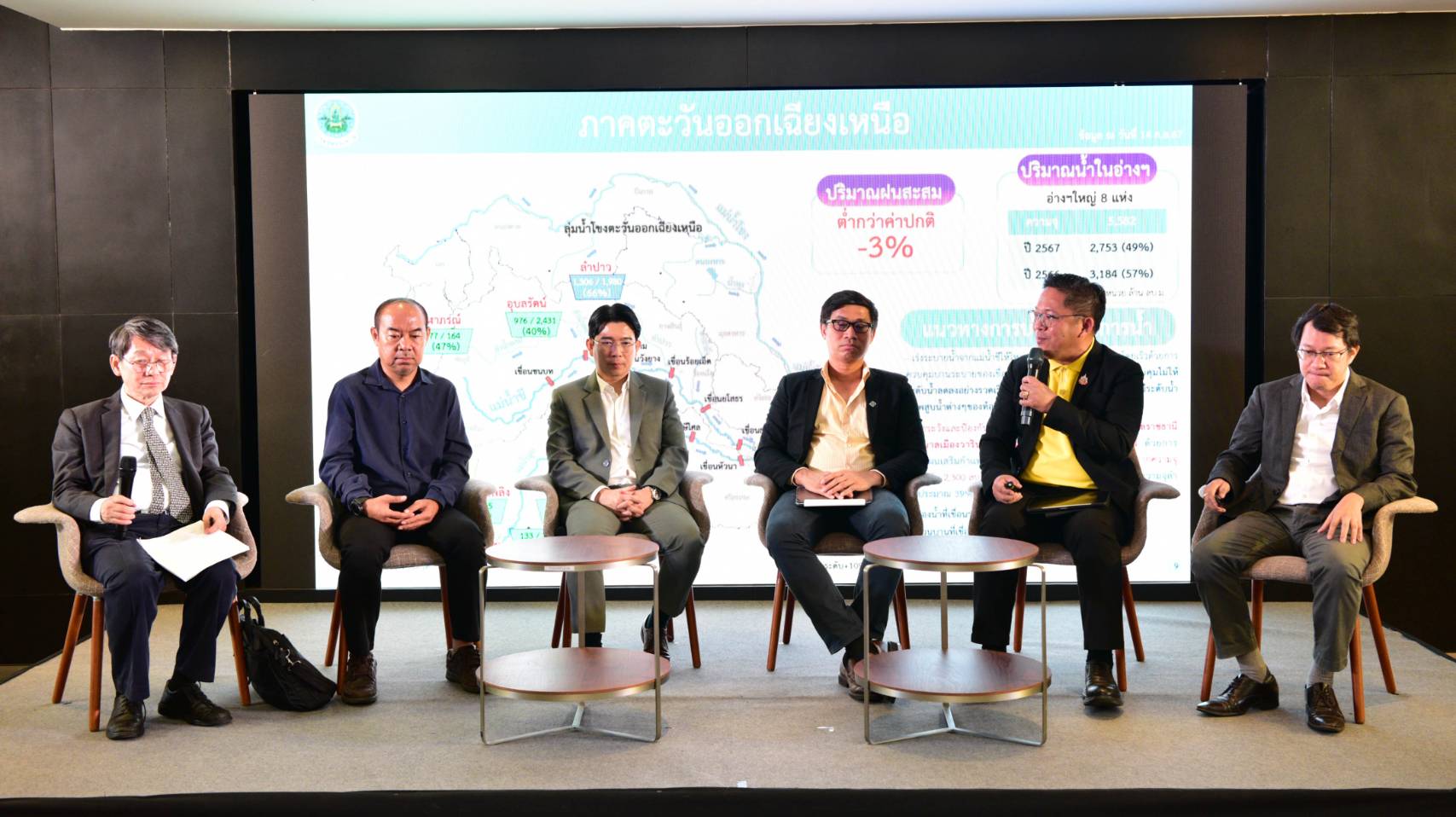 ดร.ธเนศร์ สมบูรณ์ ผู้อำนวยการสำนักบริหารจัดการน้ำและอุทกวิทยา กรมชลประทาน นำเสนอ “มาตรการการบริหารจัดการน้ำ และการป้องกันน้ำท่วม” ที่กรมชลประทานใช้ผลจากการคาดการณ์ปริมาณฝนในการวางแผนบริหารจัดการแหล่งกักเก็บน้ำ โดยการพร่องน้ำเตรียมพร้อมรับสถานการณ์ รวมถึงใช้เทคนิคการสร้างคันป้องน้ำเพิ่มประสิทธิภาพการระบายน้ำได้ในเขตอุบลราชธานี ซึ่งเป็นเทคนิคที่ลงทุนน้อย แต่ระบายน้ำได้มาก ซึ่งสถานการณ์โดยสรุปในส่วนของเชียงรายละมีแนวโน้มลดลงเรื่อย ๆ ในส่วนหนองคายซึ่งเขื่อนชัยบุรีลดการระบายน้ำจะทำให้ระดับน้ำลดลง และในส่วนภาคกลางถือว่าอยู่ในระดับปกติ ทั้งนี้ต้องประเมินสถานการณ์ฝนขณะนี้ และพายุไต้ฝุ่นช่วงปลายเดือนกันยายน - ต้นเดือนตุลาคม ซึ่งแก้มลิงในส่วนของทุ่งบางระกำและบางบาลยังสามารถรองรับได้