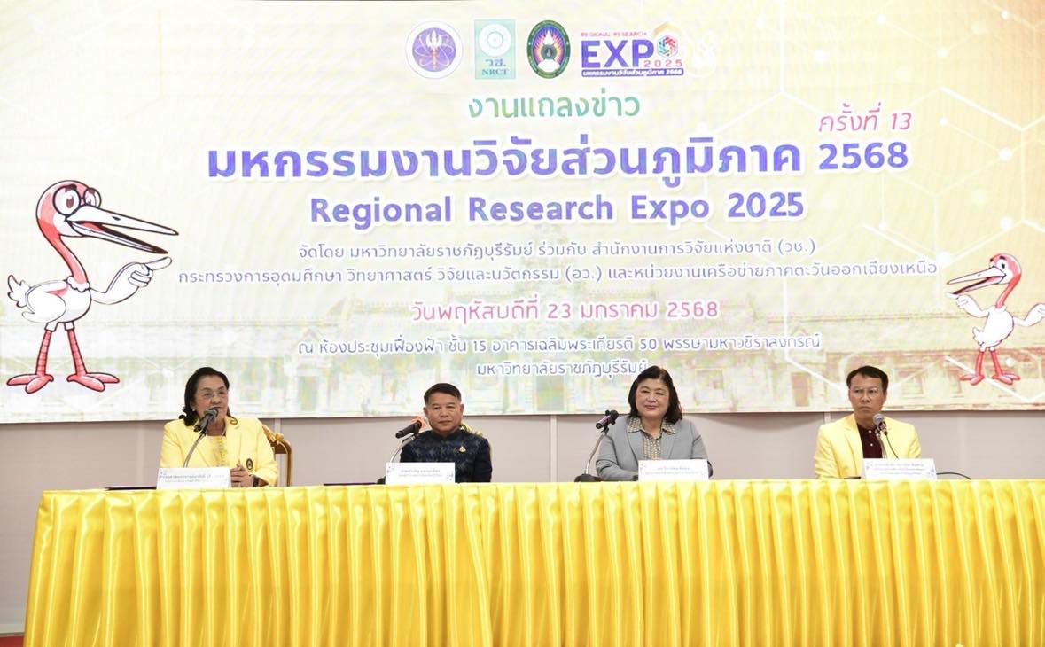 วันที่ 23 มกราคม 2568 สำนักงานการวิจัยแห่งชาติ (วช.) กระทรวงการอุดมศึกษา วิทยาศาสตร์ วิจัยและนวัตกรรม ร่วมกับ มหาวิทยาลัยราชภัฏบุรีรัมย์ จัดงานแถลงข่าว “มหกรรมงานวิจัยส่วนภูมิภาค ประจำปี 2568” ครั้งที่ 13 (Regional Research Expo 2025) ซึ่งจะจัดขึ้นระหว่างวันที่ 16 -18 กุมภาพันธ์ 2568 ภายใต้แนวคิด “สานพลังเครือข่าย พลังภูมิปัญญาท้องถิ่น เพื่อการพัฒนาเศรษฐกิจ สังคม การศึกษาและสิ่งแวดล้อมด้วยงานวิจัยนวัตกรรมและเทคโนโลยีสู่การพัฒนาอย่างยั่งยืน” โดยมีเครือข่ายวิจัยภูมิภาคตะวันออกเฉียง ซึ่งประกอบด้วยหน่วยงานภาครัฐ ภาคเอกชน องค์กรอิสระ เข้าร่วมเผยแพร่ผลงานวิจัย ณ มหาวิทยาลัยราชภัฏบุรีรัมย์