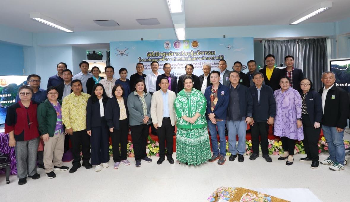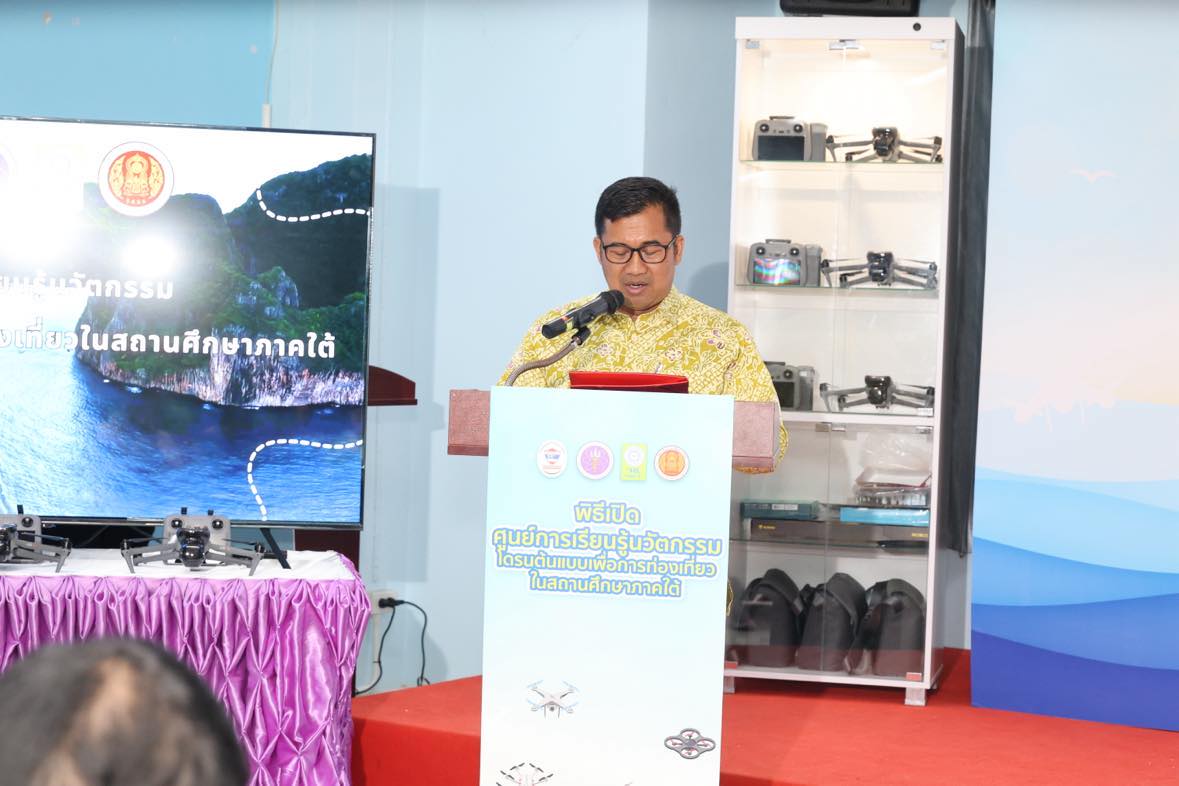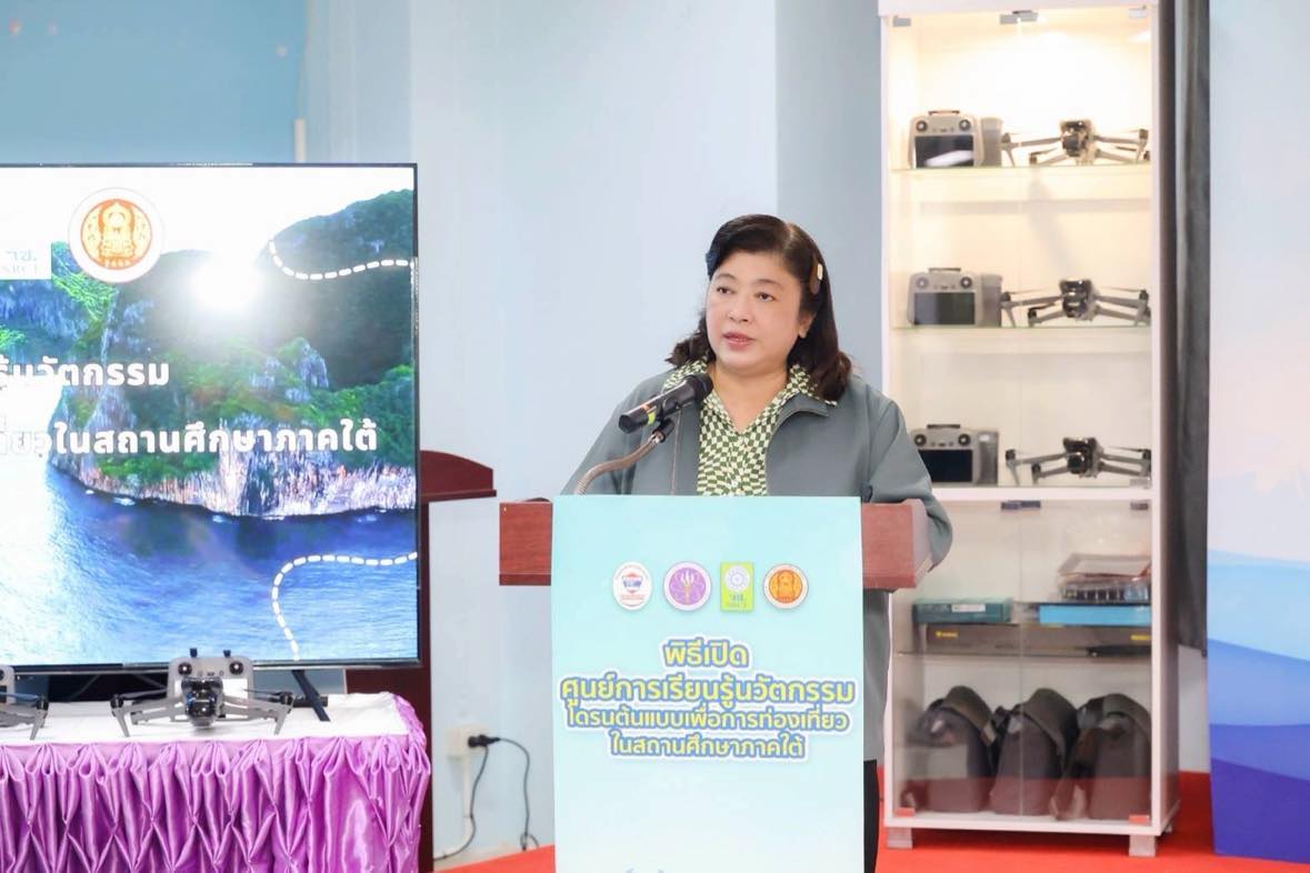 ดร.วิภารัตน์ ดีอ่อง ผู้อำนวยการสำนักงานการวิจัยแห่งชาติ กล่าวว่า โครงการศูนย์การเรียนรู้นวัตกรรมโดรนต้นแบบเพื่อการท่องเที่ยวในสถานศึกษาภาคใต้เป็นการประยุกต์ใช้เทคโนโลยีโดรนเพื่อส่งเสริมอุตสาหกรรมการท่องเที่ยวและยกระดับการเรียนรู้ในสถานศึกษา โดยในช่วงแรกของการดำเนินงาน ได้มีการจัดตั้งศูนย์การเรียนรู้เทคโนโลยีโดรนในสถานศึกษาในพื้นที่ที่เป็นแหล่งท่องเที่ยว ณ จังหวัดสุราษฏร์ธานี และจังหวัดกระบี่ เพื่อถ่ายทอดองค์ความรู้และฝึกทักษะการบินโดรนให้แก่เยาวชนในพื้นที่จังหวัดสุราษฎร์ธานี จังหวัดกระบี่ และพื้นที่ใกล้เคียง โดยมีการนำโดรนและชุดอุปกรณ์สำหรับฝึกทักษะการบิน โปรแกรมและคอมพิวเตอร์ เพื่อใช้ในการเรียนการสอนและฝึกพัฒนาทักษะด้านการบินโดรน จัดตั้งเป็นศูนย์การเรียนรู้ รวมถึงการพัฒนาทักษะด้านเทคโนโลยีให้คณาจารย์และทีมเยาวชนในสถาบันการศึกษา ซึ่งจะเป็นพื้นฐานในการสร้างสรรค์การท่องเที่ยวและพัฒนาพื้นที่ให้เติบโตทางเศรษฐกิจด้วยการท่องเที่ยว โดยใช้วิจัยและนวัตกรรม