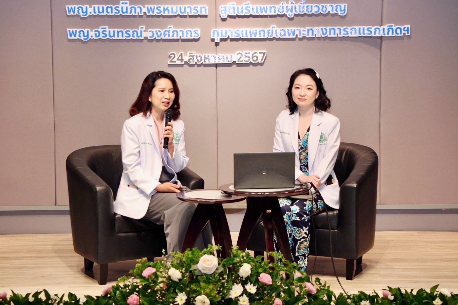 ศูนย์แม่และเด็ก โรงพยาบาลหัวเฉียว จัดกิจกรรมเพื่อคุณแม่ตั้งครรภ์ เป็นการเตรียมความพร้อมให้กับคุณพ่อคุณแม่ในการต้อนรับสมาชิกใหม่คนสำคัญของครอบครัว ภายในงานจัดให้มีเสวนาเรื่อง 9 เดือน.. ก้าวสำคัญของคุณแม่และลูกน้อยโดยทีมวิทยากร พญ.เนตรนิภา พรหมนารท (ซ้าย) สูตินรีแพทย์ผู้ชำนาญการ และ พญ.จรินทรณ์ วงศ์ภากร (ขวา) กุมารแพทย์เฉพาะทางทารกแรกเกิดและปริกำเนิด