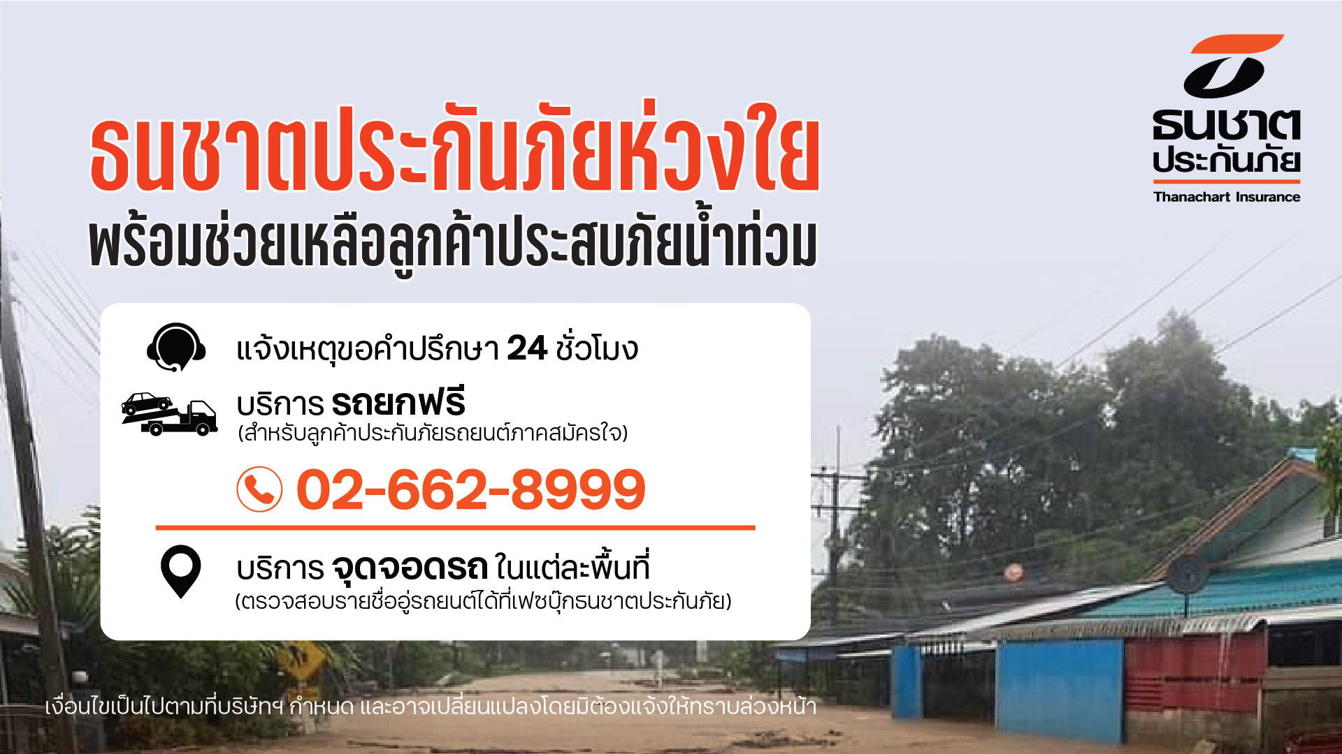 ธนชาตประกันภัย ห่วงใยลูกค้าประสบภัยน้ำท่วม เร่งให้ความช่วยเหลือ จัดเจ้าหน้าที่รับแจ้งเหตุและให้คำปรึกษาตลอด 24 ชั่วโมง พร้อมบริการรถยกฟรี!