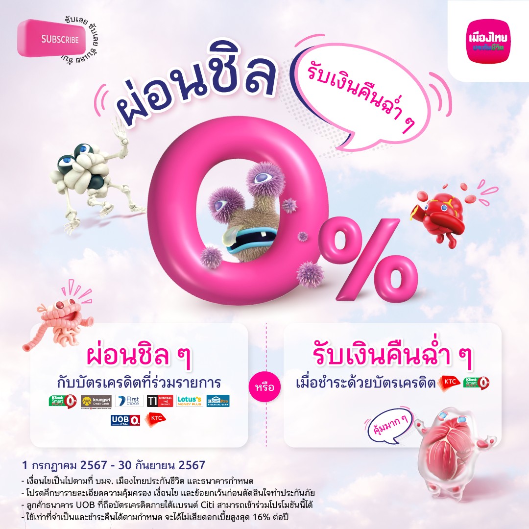 เมืองไทยประกันชีวิต ผนึกกำลังพันธมิตรบัตรเครดิตชั้นนำ จัดแคมเปญ ผ่อนชิล รับเงินคืนฉ่ำ ๆ โปรโมชันผ่อนค่าเบี้ยสบาย ๆ 0% หรือรับเครดิตเงินคืนสูงสุด 13% กับบัตรเครดิตที่ร่วมรายการ ตอบโจทย์ความต้องการ และเพิ่มความสะดวกแก่ลูกค้าในการชำระเบี้ยประกันภัย