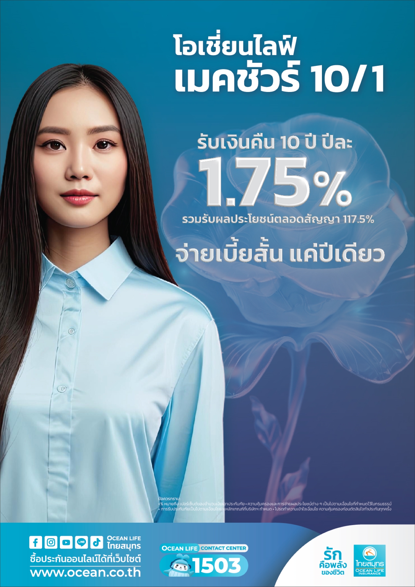 OCEAN LIFE ไทยสมุทร ใช้ความรักเป็นพลังขับเคลื่อนองค์กรมายาวนาน 75 ปี โดยไม่หยุดพัฒนาในทุกมิติเพื่อทำให้ประกันชีวิตเป็นเรื่องง่ายทำให้คนไทยเข้าถึงประโยชน์ของการประกันชีวิตได้มากที่สุดพร้อมแล้วที่จะเป็นส่วนหนึ่งในการดูแลโลกและสังคมเพื่อส่งมอบอนาคตที่ยั่งยืนให้กับคนรุ่นต่อไปได้ ใช้ชีวิตอย่างมั่นคง มั่นใจ ปลอดภัย มีความสุข สนใจติดตามรายละเอียดเพิ่มเติมได้ที่ www.ocean.co.th หรือ ติดต่อ OCEAN LIFE CONTACT CENTER 1503