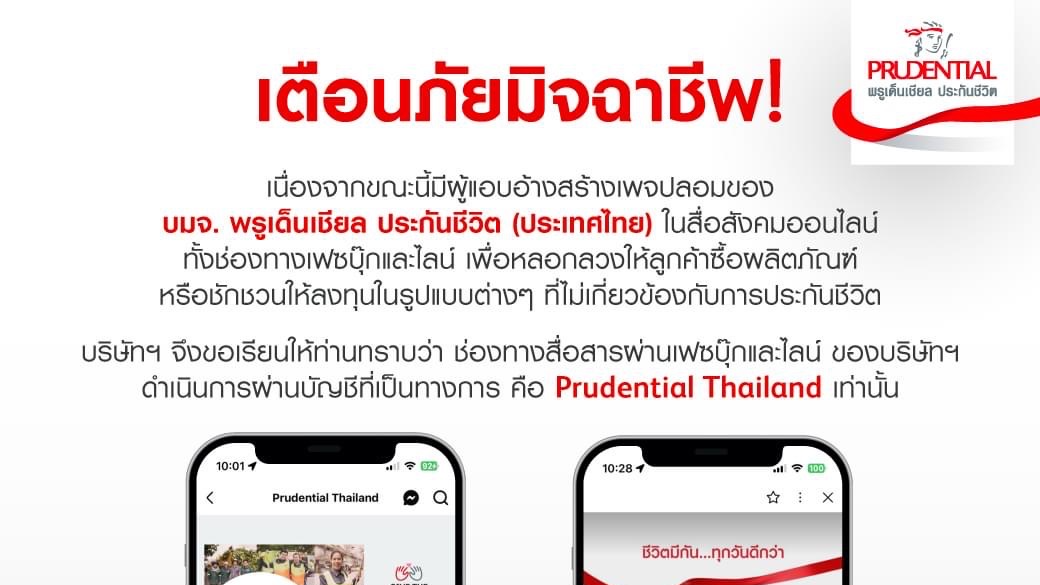 เนื่องจากขณะนี้มีผู้แอบอ้างสร้างเพจของ บมจ. พรูเด็นเชียล ประกันชีวิต (ประเทศไทย) ปลอม ในสื่อสังคมออนไลน์ ทั้งช่องทางเฟซบุ๊กและไลน์ เพื่อหลอกลวงให้ลูกค้าซื้อผลิตภัณฑ์ หรือชักชวนให้ลงทุนในรูปแบบต่าง ๆ ที่ไม่เกี่ยวข้องกับการประกันชีวิต
