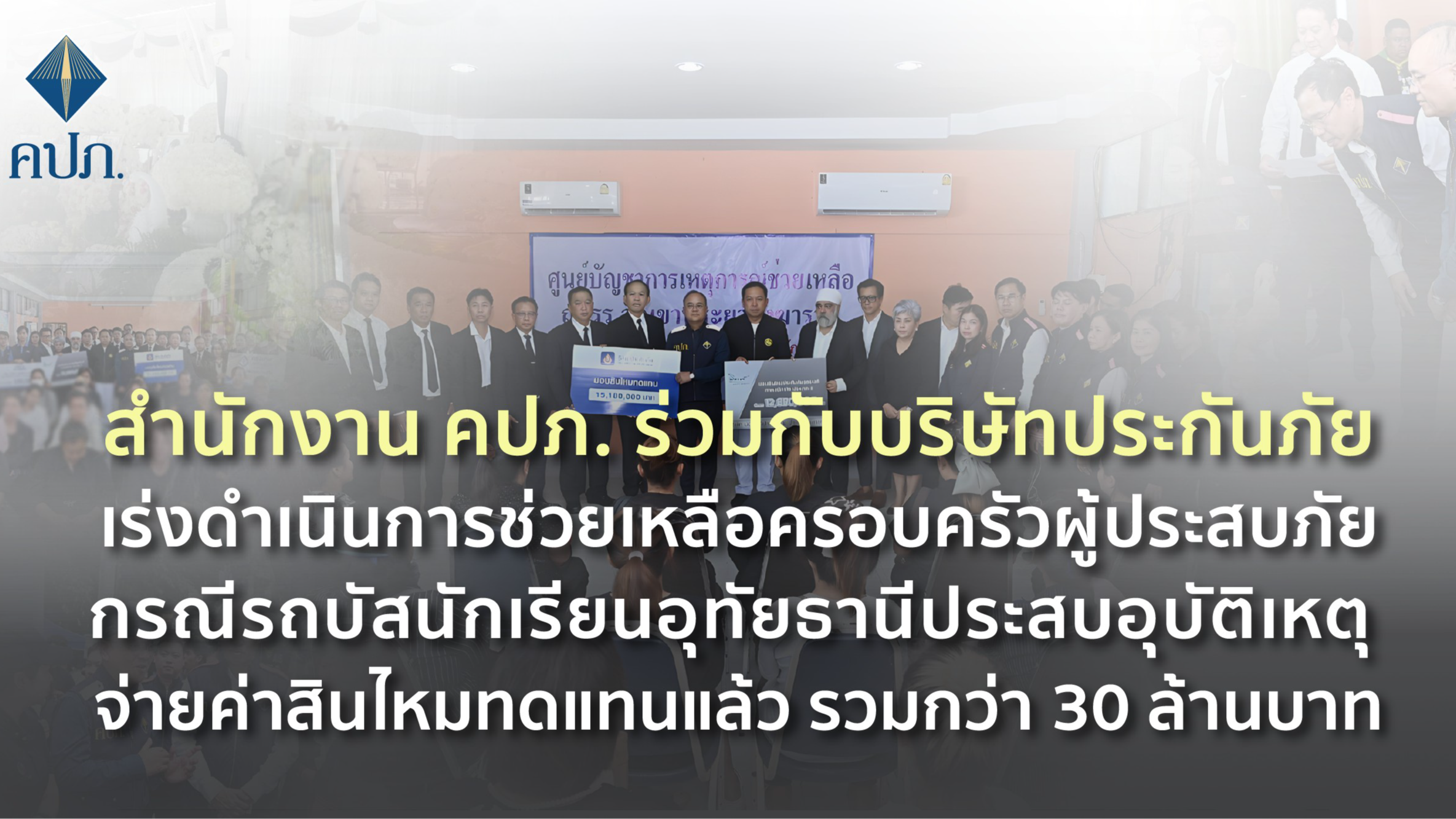 สำนักงาน คปภ. ร่วมกับบริษัทประกันภัยเร่งดำเนินการช่วยเหลือครอบครัวผู้ประสบภัย กรณีรถบัสนักเรียนอุทัยธานีประสบอุบัติเหตุ จ่ายค่าสินไหมทดแทนแล้ว รวมกว่า 30 ล้านบาท