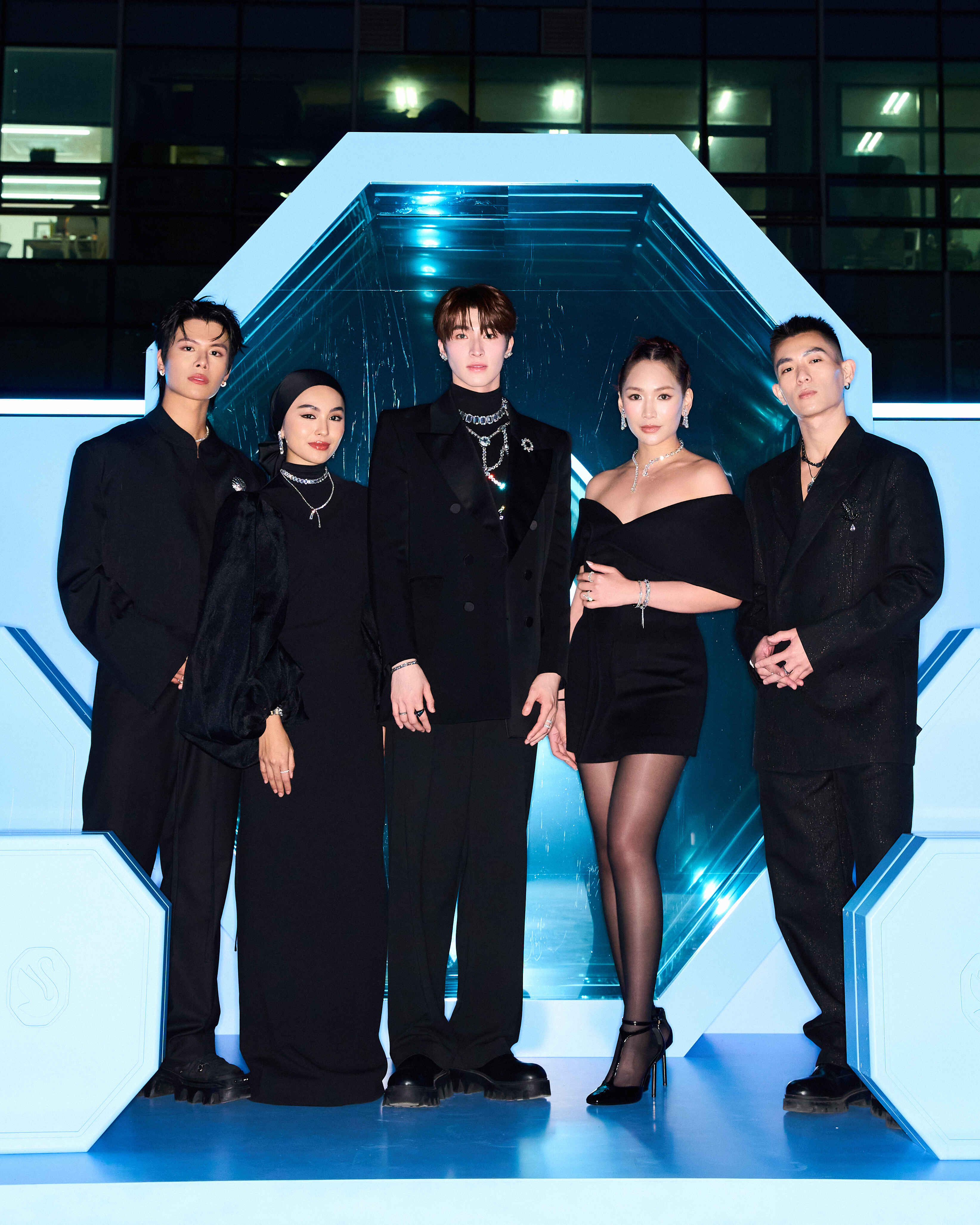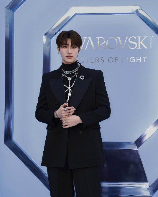 บลู พงศ์ทิวัตถ์ ตั้งวันเจริญ จัดเต็มในลุคที่แต่งแต้มด้วยด้วยจิวเวลรีประดับเรือนร่างที่ทำขึ้นมาเป็นพิเศษโดยสวารอฟสกี้ เข้าชุดกับเข็มกลัด Matrix สร้อยคอ Millenia ต่างหู Millenia และชุดแหวน Matrix, Hyperbola และ Lucent ทำให้ภาพรวมลุคดูโดดเด่นอย่างมีสไตล์