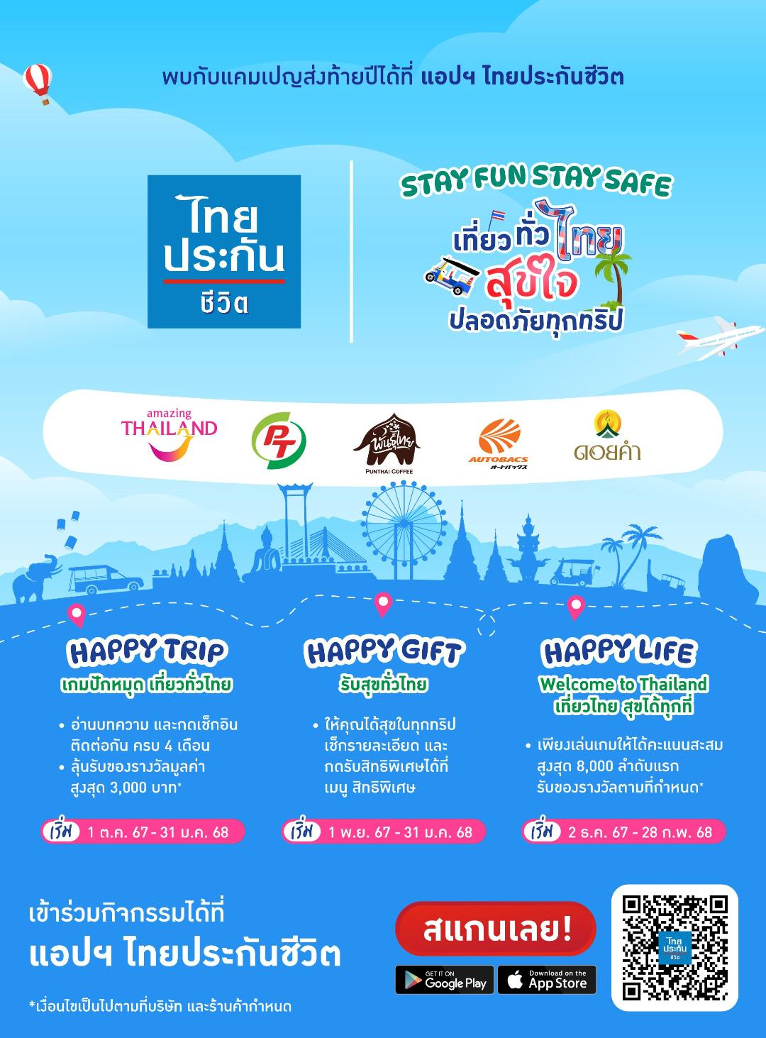 แคมเปญ “Stay Fun Stay Safe เที่ยวทั่วไทยสุขใจ ปลอดภัยทุกทริป” ประกอบด้วย 3 กิจกรรม ได้แก่ HAPPY TRIP: ปักหมุด เที่ยวทั่วไทย เพียงอ่านบทความท่องเที่ยวจากการท่องเที่ยวแห่งประเทศไทย (ททท.) และกดเช็กอินผ่านแอปพลิเคชันไทยประกันชีวิต ติดต่อกันครบ 4 เดือน ลุ้นรับของรางวัลมูลค่าสูงสุด 3,000 บาท HAPPY GIFT: รับสุขทั่วไทย สิทธิพิเศษถูกใจนักเดินทาง ที่คัดสรรของรางวัลมามอบให้หลากหลาย อาทิ E-Coupon ส่วนลดนํ้ามัน PT E-Coupon เครื่องดื่มจากร้านกาแฟพันธุ์ไทย E-Coupon จากร้านดอยคำ และส่วนลดบริการจากศูนย์ดูแลรถยนต์ Autobacs และ HAPPY LIFE: Welcome to Thailand เที่ยวไทย สุขได้ทุกที่ สะสมคะแนนจากการเล่นเกมสูงสุด 8,000 ลำดับแรก รับของรางวัลพิเศษมากมายจากแคมเปญ (คลิกเพื่อเข้าร่วมกิจกรรมได้ที่ แอปพลิเคชัน ไทยประกันชีวิต https://thailifeapplication.page.link/StayFunStaySafe)