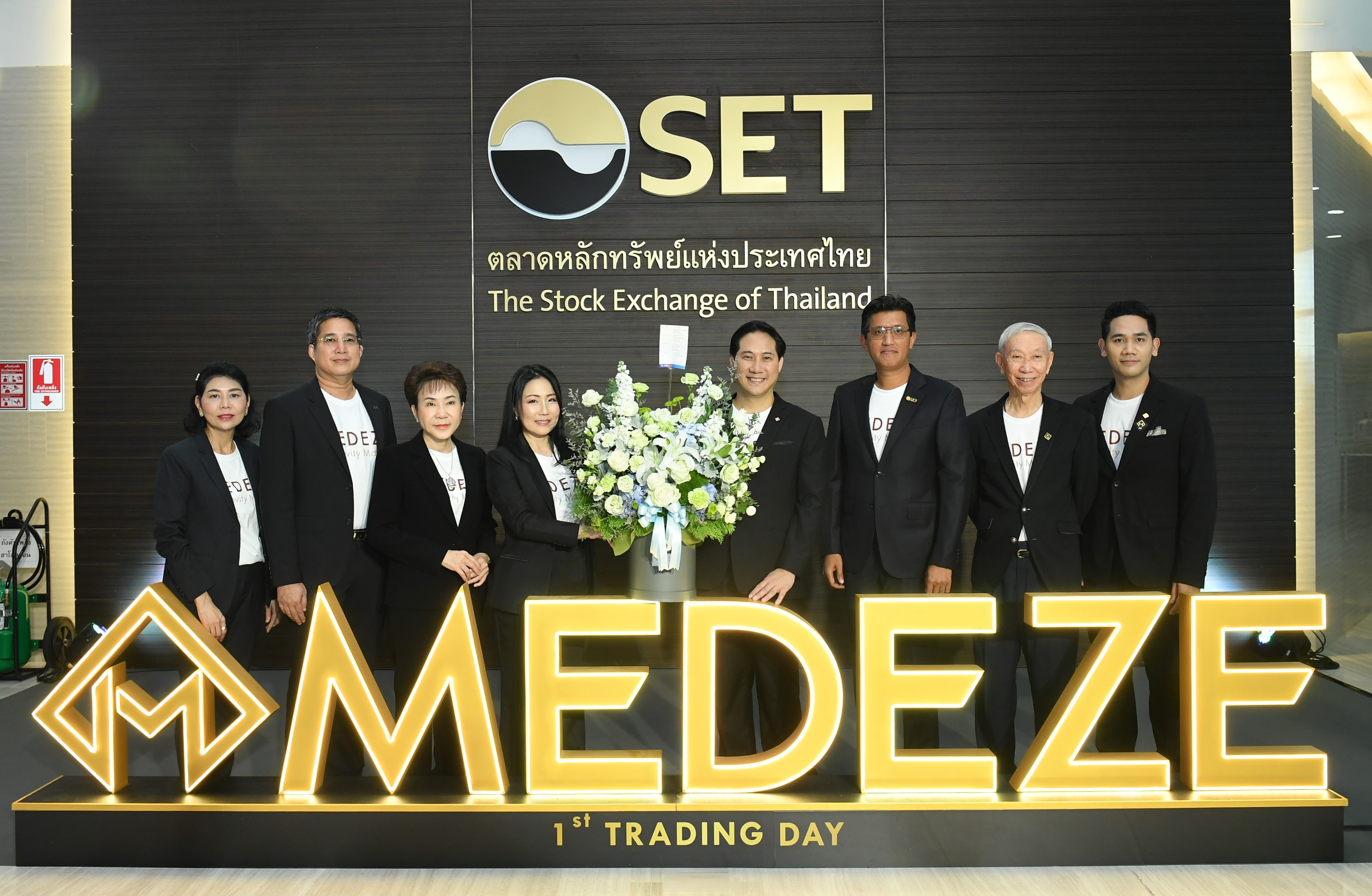 นางบุญพร บริบูรณ์ส่งศิลป์ (ที่ 3 จากซ้าย) ประธานเจ้าหน้าที่บริหาร นายพายุพัด มหาผล (ที่ 2 จากซ้าย) กรรมการผู้จัดการ ฝ่ายวาณิชธนกิจ นางสาวสุภาพร แก้วกาญจนดิษฐ (ที่ 1 จากซ้าย) รองกรรมการผู้จัดการ หัวหน้าฝ่ายนักลงทุนสัมพันธ์ บริษัทหลักทรัพย์ หยวนต้า (ประเทศไทย) จำกัด ในฐานะที่ปรึกษาทางการเงินและผู้จัดการการจัดจำหน่ายและรับประกันการจำหน่ายหุ้น และ นายอัสสเดช คงสิริ (ที่ 3 จากขวา) กรรมการและผู้จัดการตลาดหลักทรัพย์แห่งประเทศไทย ร่วมแสดงความยินดีกับ นายแพทย์วีรพล เขมะรังสรรค์ (ที่ 4 จากขวา) ประธานเจ้าหน้าที่บริหาร นางสาวดนิตา พิทักษ์เนติกุล (ที่ 4 จากซ้าย) ประธานเจ้าหน้าที่สายพัฒนาธุรกิจ นายปิยวัชร ราชพลสิทธิ์ (ที่ 1 จากขวา) ประธานกรรมการลงทุน รศ.ดร.ไพบูลย์ เสรีวิวัฒนา (ที่ 2 จากขวา) ที่ปรึกษาวางแผนทางการเงิน บริษัท เมดีซ กรุ๊ป จำกัด (มหาชน) หรือ MEDEZE ในพิธีเปิด “การซื้อขายหลักทรัพย์วันแรกในตลาดหลักทรัพย์แห่งประเทศไทย” ของบริษัท เมดีซ กรุ๊ป จำกัด (มหาชน) ณ หอประชุมศุกรีย์ แก้วเจริญ อาคาร B ชั้น 3 อาคารตลาดหลักทรัพย์แห่งประเทศไทย