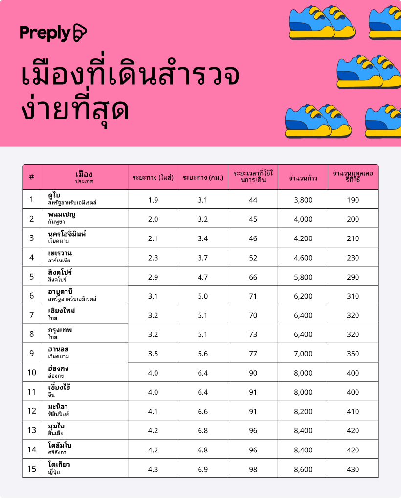 ใช้บทความนี้เป็นตัวช่วยในการวางแผนทริปในเมืองที่เหมาะสมสำหรับคุณ โดยคำนึงถึงระยะทางที่คุณสามารถเดินได้อย่างสะดวก บางทีอาจเริ่มด้วยการเดินระยะสั้นๆ ระหว่างสถานที่ท่องเที่ยวหลัก หรือหากคุณพร้อมสำหรับการพักผ่อนแบบลุยๆ คุณอาจลองเดินสำรวจในเส้นทางที่มีความท้าทายขึ้น นอกจากนี้ถ้ารู้สึกเมื่อยแล้วอาจจะลองสำรวจการเดินทางด้วยระบบขนส่งสาธารณะ เพื่อดูว่าคนในท้องถิ่นเดินทางกันอย่างไร เราเชื่อว่าบางครั้งการเดินทางก็เป็นสิ่งที่น่าจดจำไม่แพ้จุดหมายปลายทาง