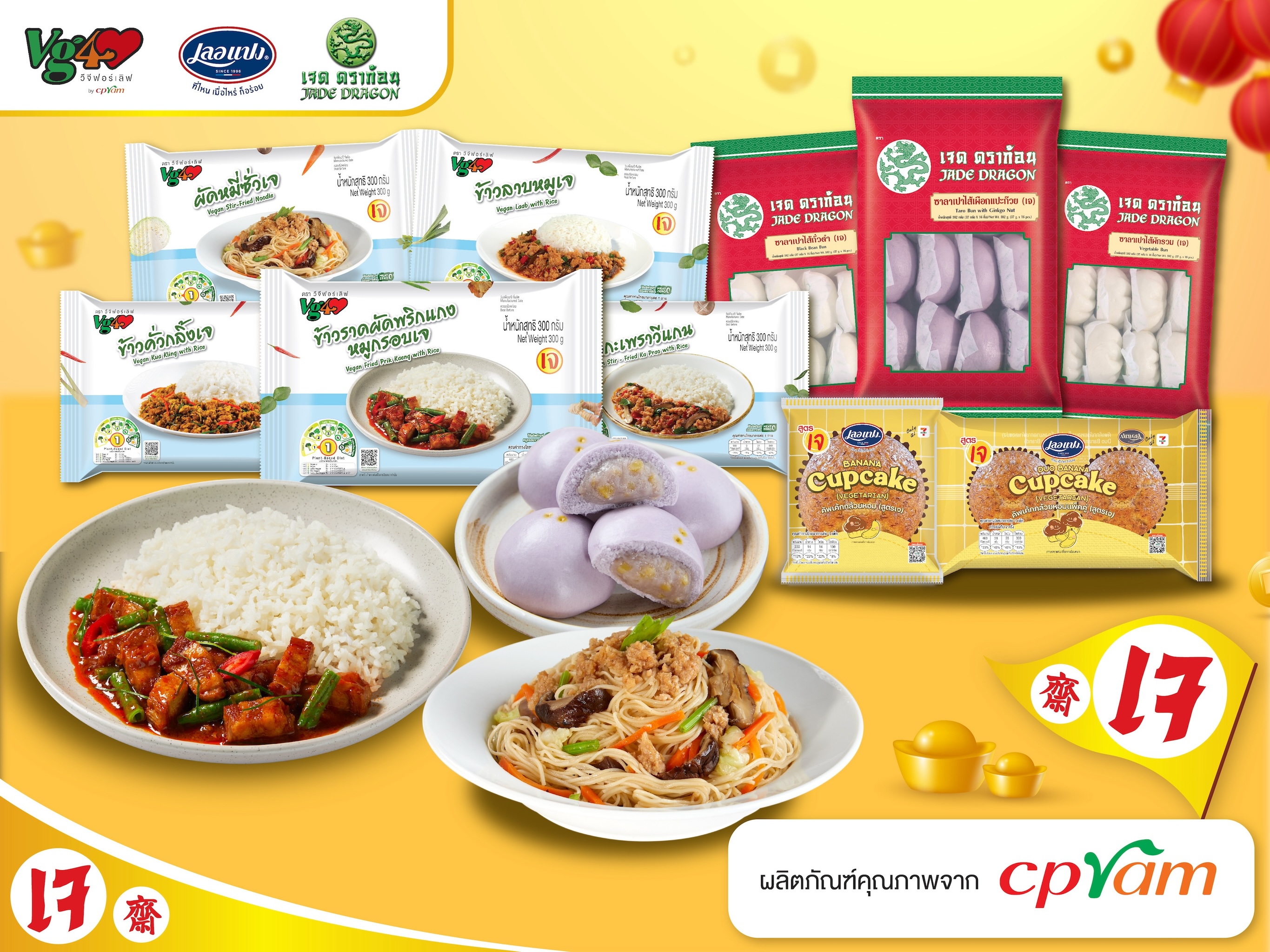 ปีนี้ ซีพีแรมพร้อมนำเสนอผลิตภัณฑ์อาหารเจ หลายหลายเมนูให้ผู้บริโภคเลือกสรรเพื่อต้อนรับเทศกาลกินเจ 2567 มอบความอร่อยและปรุงง่ายกับเมนูยอดฮิต ชวนอิ่มท้องเพิ่มพลังบุญจากผลิตภัณฑ์ “วีจี ฟอร์ เลิฟ” หลากหลายเมนู ทั้งข้าวลาบหมูเจ ข้าวคั่วกลิ้งเจ ผัดหมี่ซั่วเจ ข้าวคะน้าหมูกรอบเจ ข้าวราดผัดพริกแกงหมูกรอบเจ และเส้นหมี่ผัดซีอิ๊วเจ พร้อมเบเกอรี่เมนูเด็ดจาก เลอแปง ให้คุณอร่อยกับคัพเค้กกล้วยหอมสูตรเจ ให้คุณอร่อยกับคัพเค้กกล้วยหอมสูตรเจ ปิดท้ายด้วยแบรนด์ เจด ดราก้อน จัดเต็มกับซาลาเปาไส้เผือกเจ ซาลาเปาไส้เห็ดทรงเครื่องเจ ซาลาเปาไส้ผักรวมเจ และอีก 2 เมนูใหม่ ซาลาเปาไส้งาดำนมถั่วเหลือง และซาลาเปาไส้พุทราจีน เติมเต็มทุกมื้ออาหารให้อิ่มอร่อยได้ง่าย ๆ ด้วยผลิตภัณฑ์ซีพีแรม