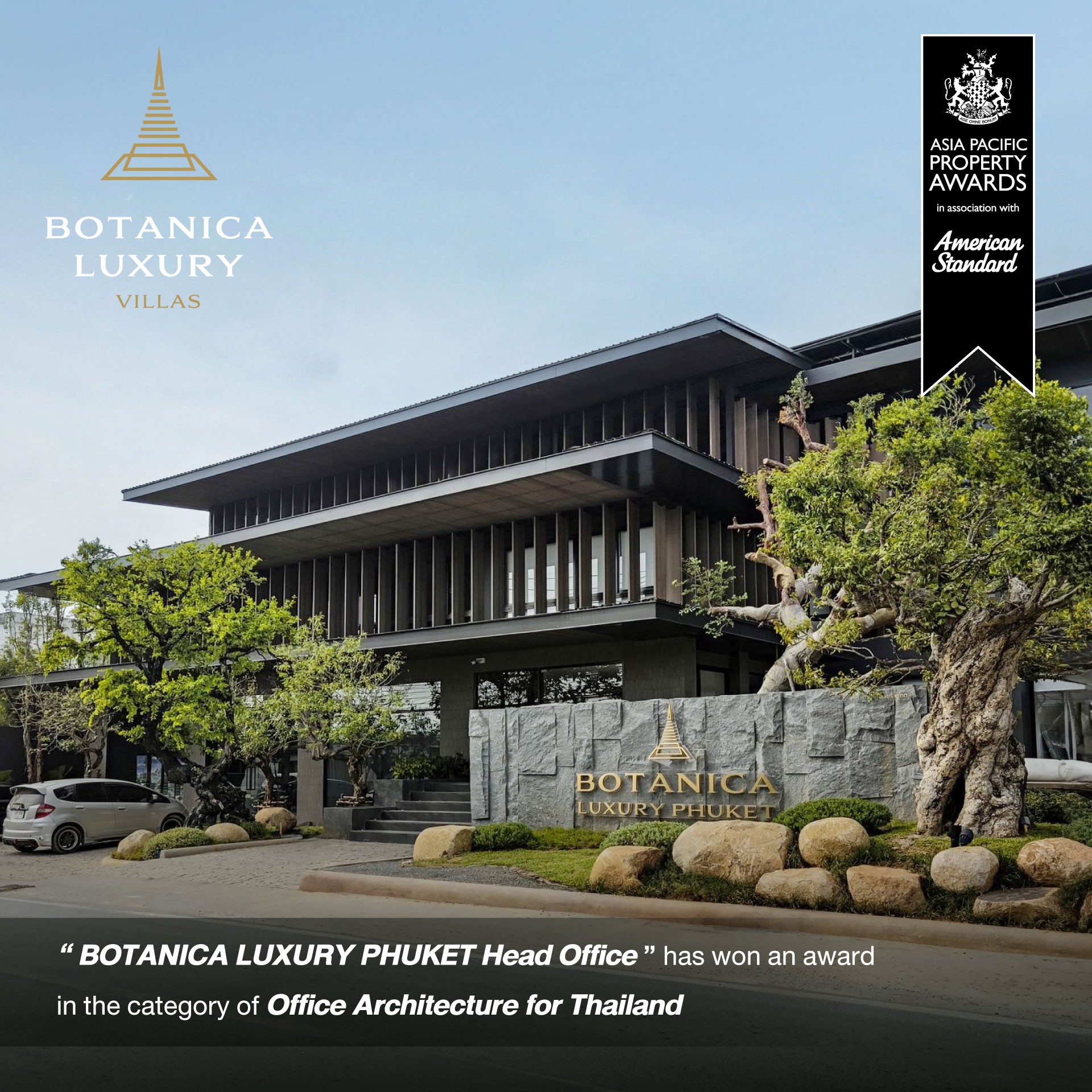 BOTANICA LUXURY PHUKET Head Office สำนักงานใหญ่ของโครงการ ได้รับรางวัล “Office Architecture for Thailand” รางวัลสุดพิเศษที่เชิดชูการออกแบบออฟฟิศยอดเยี่ยม สะท้อนถึงความตั้งใจของบริษัทในการสร้างสิ่งแวดล้อมที่ดีและมอบสิ่งอำนวยความสะดวกที่ส่งเสริมความสุขของพนักงาน ผู้เป็นแรงขับเคลื่อนความสำเร็จของทุกโครงการ
