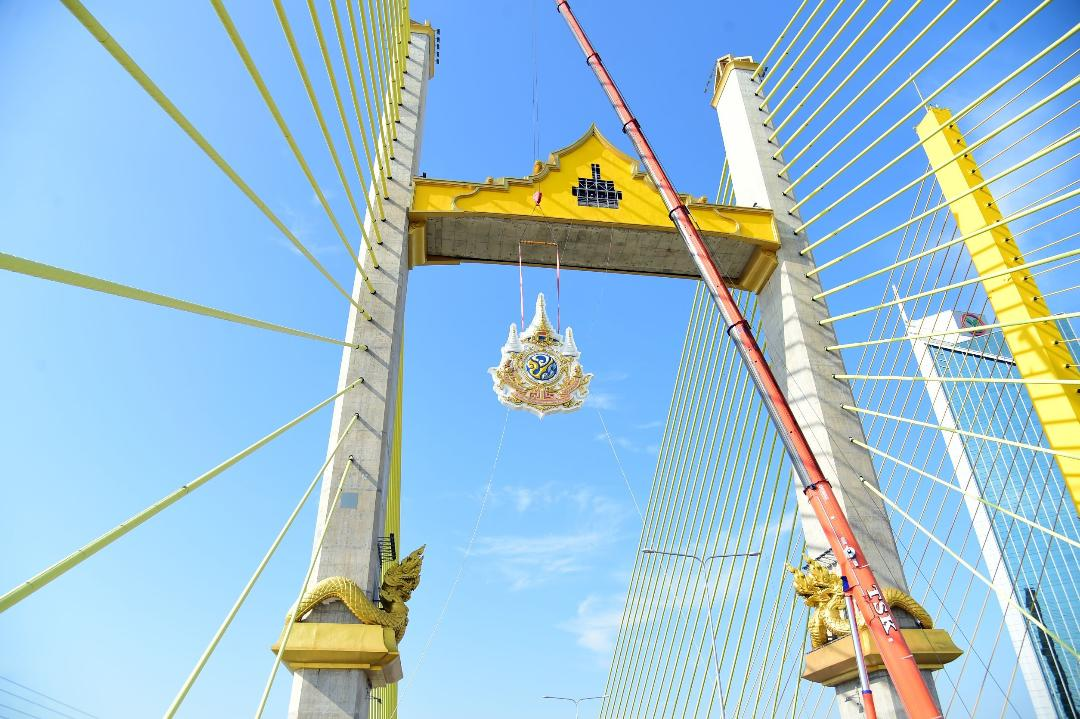 2. ตราสัญลักษณ์ฯ จำนวน 4 ตรา ติดตั้งบริเวณ Upper Crossbeam ของเสา (Pylon) ซึ่งมีความสูงจากระดับผิวถนนบนสะพานทศมราชัน ประมาณ 52 เมตร โดยมีตำแหน่งติดตั้ง 4 ตำแหน่ง คือ ฝั่งกรุงเทพมหานคร-ขาเข้า ฝั่งกรุงเทพมหานคร-ขาออก ฝั่งธนบุรี-ขาเข้า ปัจจุบันได้ดำเนินการติดตั้งเสร็จเรียบร้อยแล้ว และตำแหน่งสุดท้าย ฝั่งธนบุรี-ขาออก ได้ดำเนินการติดตั้งแล้วเสร็จสมบูรณ์ในวันนี้ (24 ตุลาคม 2567)