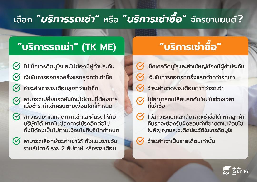 ส่วน “บริการรถเช่า” รถจักรยานยนต์ ซึ่งปัจจุบัน TK มีให้บริการภายใต้แบรนด์ “TK Me” เป็นบริการที่แตกต่างจาก “บริการเช่าซื้อ” ตรงที่ไม่มีการเช็คเครดิตบูโร แต่เงินค่าบริการและค่าเช่าล่วงหน้าที่จ่ายครั้งแรก รวมไปถึงเงินชำระค่าเช่าต่อเดือนจะสูงกว่า “บริการเช่าซื้อ” อย่างไรก็ตาม “บริการรถเช่า” มีข้อดีที่ผู้เช่าสามารถเปลี่ยนรถคันใหม่ได้ตามต้องการได้เมื่อชำระค่าเช่าครบตามเงื่อนไขที่กำหนด นอกจากนี้ ยังสามารถยกเลิกสัญญาเช่าและคืนรถได้หากไม่ต้องการใช้รถต่อไป ทั้งนี้ จะต้องศึกษาเงื่อนไขการคืนรถตามที่บริษัทให้เช่าได้กำหนดไว้ ที่สำคัญคือผู้เช่าสามารถเลือกชำระค่าเช่าได้ตามความสามารถในการชำระ ไม่ว่าจะเป็นการชำระแบบรายวัน รายสัปดาห์ ราย 2 สัปดาห์ หรือรายเดือน