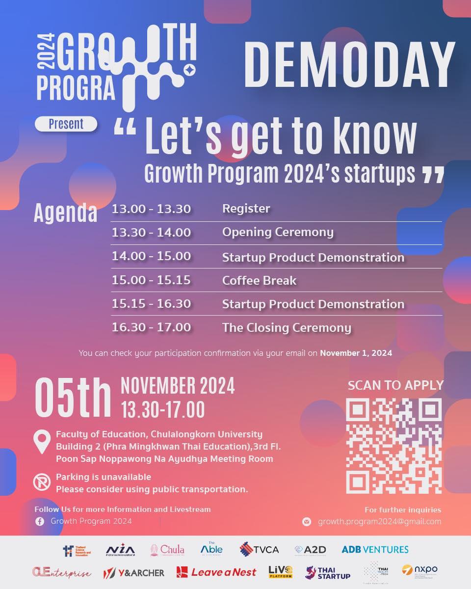 กำหนดการ งาน Demo Day โครงการ Growth Program 2024 วันอังคารที่ 5 พฤศจิกายน 2567 ตั้งแต่เวลา 13.00 – 17.00 น. ณ ห้องประชุมพูนทรัพย์ นพวงศ์ ณ อยุธยา ชั้น 3 อาคารพระมิ่งขวัญการศึกษาไทย คณะครุศาสตร์ จุฬาลงกรณ์มหาวิทยาลัย