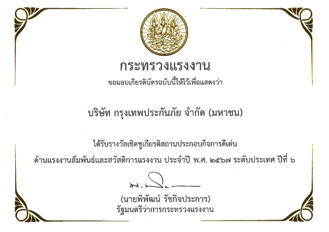 สำนักบริหารแบรนด์องค์กร บมจ.กรุงเทพประกันภัย ขอนำส่งข่าวประชาสัมพันธ์ “กรุงเทพประกันภัยภาคภูมิใจ รับรางวัลเชิดชูเกียรติสถานประกอบกิจการดีเด่น ประจำปี 2567 ระดับประเทศ ต่อเนื่องเป็นปีที่ 6”