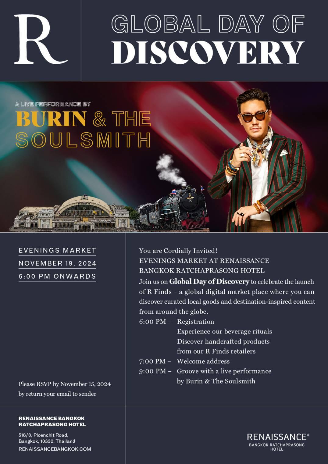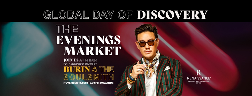 กรุงเทพฯ, 5 พฤศจิกายน 2567 – โรงแรมเรเนซองส์ กรุงเทพฯ ราชประสงค์ ขอเชิญชวนผู้สนใจและสมาชิก Marriott Bonvoy ทุกท่าน ร่วมเฉลิมฉลอง Global Day of Discovery ในบรรยากาศอันสุดแสนประทับใจ โดยงานนี้ได้รวบรวมกิจกรรมสุดพิเศษ ตั้งแต่การสำรวจชุมชนย่านสถานีรถไฟหัวลำโพงพร้อมเข้าชมพิพิธภัณฑ์ที่เต็มไปด้วยเสน่ห์ของกรุงเทพฯ ไปจนถึงปาร์ตี้สุดเหวี่ยงกับคอนเสิร์ต จากศิลปินดัง บุรินทร์ บุญวิสุทธิ์ มาร่วมเดินทางผ่านวัฒนธรรมที่หลากหลายของกรุงเทพฯ ในแบบที่คุณไม่เคยสัมผัสมาก่อน