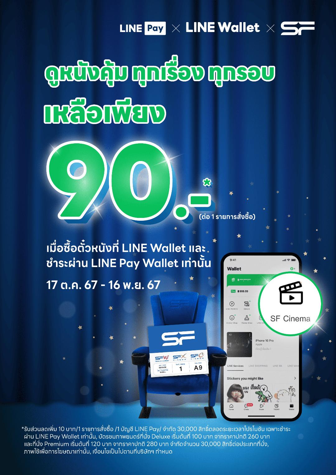 พิเศษ! เพียงซื้อบัตรชมภาพยนตร์ผ่านเมนู SF Cinema ในหน้า Wallet บนแอปพลิเคชัน LINE และชำระเงินผ่าน LINE Pay ตั้งแต่วันนี้จนถึงวันที่ 16 พฤศจิกายน 2567 รับสิทธิ์ซื้อบัตรชมภาพยนตร์ราคาพิเศษ และพิเศษยิ่งขึ้น! รับส่วนลดเพิ่มเติมที่นั่งละ 10 บาท เมื่อเลือกชำระเงินผ่าน “LINE Pay Wallet”2
