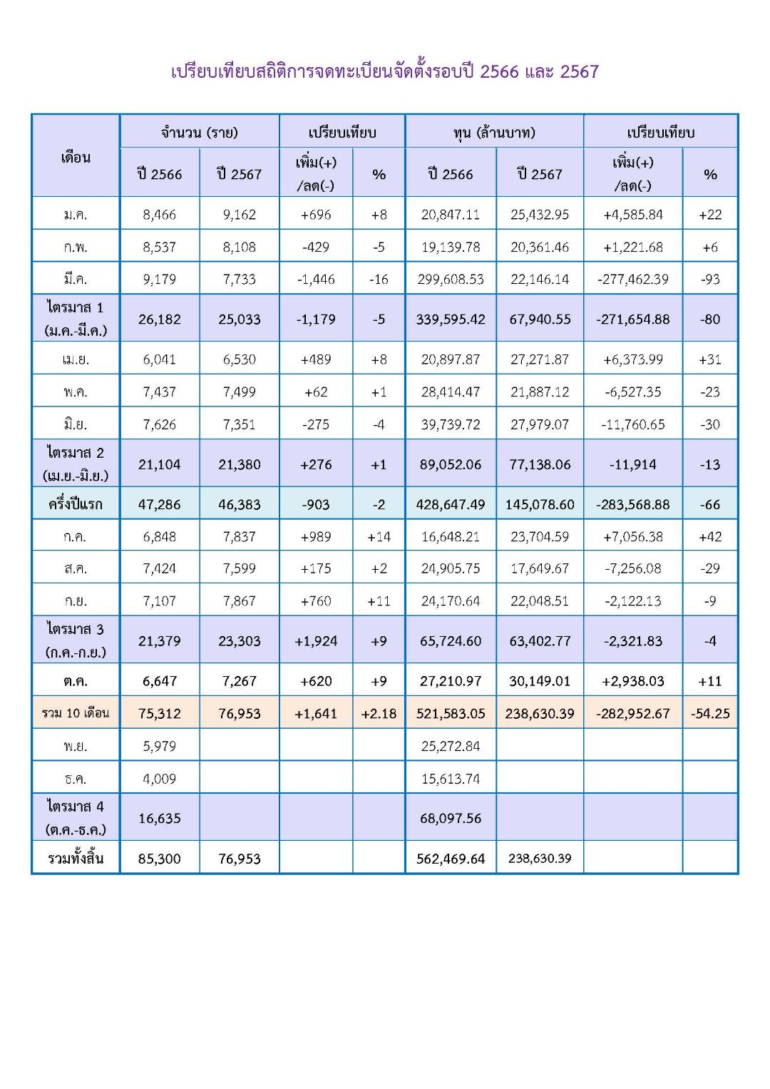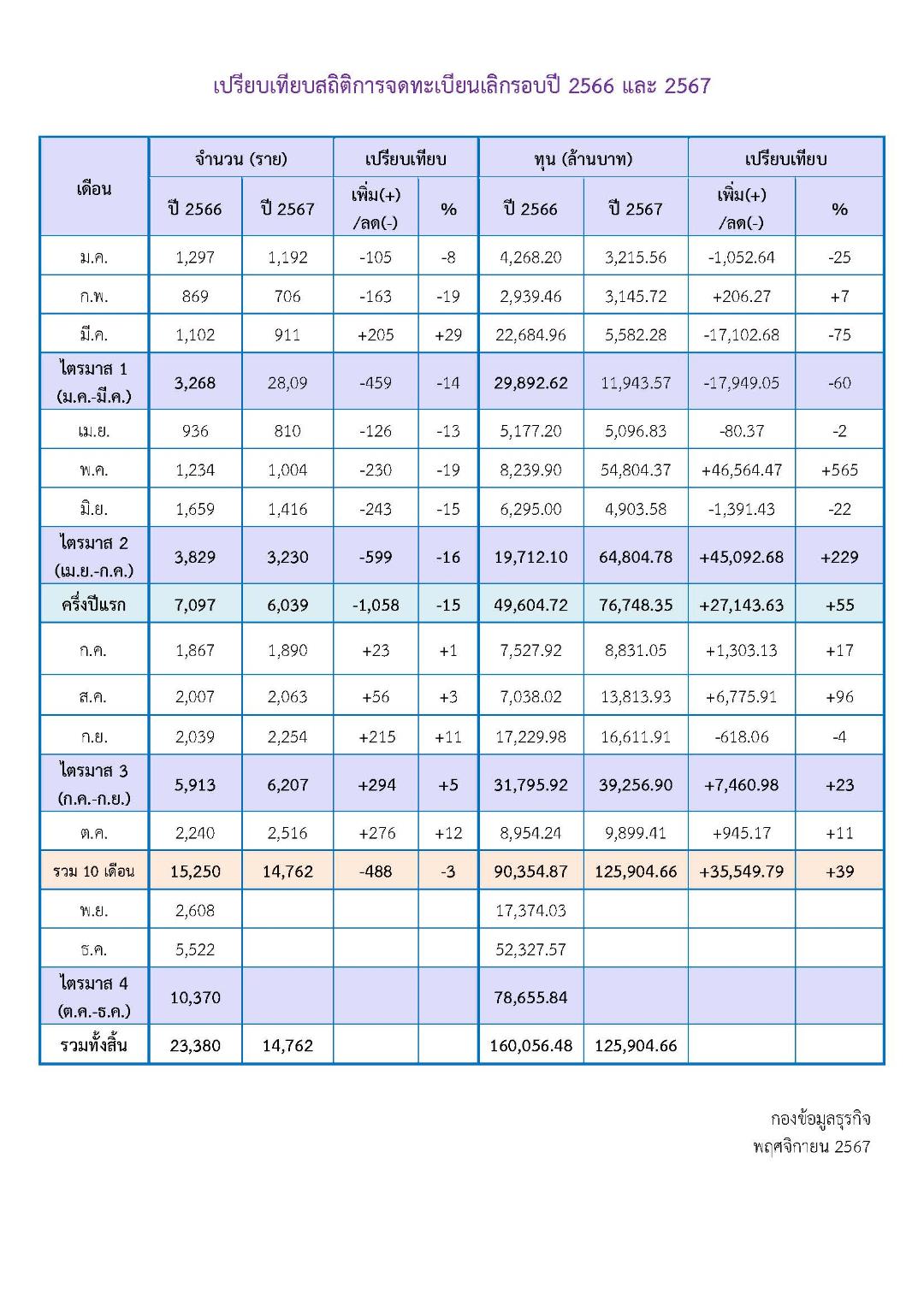 การจดทะเบียนเลิกประกอบกิจการสะสม 10 เดือน (มกราคม - ตุลาคม 2567) มีจำนวน 14,762 ราย เมื่อเทียบกับช่วงเวลาเดียวกันของปี 2566 ลดลง 488 ราย (3.20%) ทุนจดทะเบียนเลิกสะสม 125,904.66 ล้านบาท เมื่อเทียบกับช่วงเวลาเดียวกันของปี 2566 เพิ่มขึ้น 35,549.79 ล้านบาท (39.34%) ทั้งนี้ สืบเนื่องมาจากในเดือนพฤษภาคม 2567 มีธุรกิจด้านโทรคมนาคมและการสื่อสาร 1 ราย ที่ทุนจดทะเบียนกว่า 48,209.34 ล้านบาท แต่มีการปรับโครงสร้างการดำเนินการและไม่ได้ประกอบกิจการใดแล้วจึงจดทะเบียนเลิกธุรกิจ เป็นเหตุให้ตัวเลขทุนจดทะเบียนเลิกสะสมในช่วง 10 เดือน ปี 2567 สูงกว่าปกติ ซึ่งหากไม่รวมทุนจดทะเบียนเลิกของธุรกิจโทรคมนาคมรายนี้ มูลค่าทุนจดทะเบียนเลิกจะลดลงถึง 14% จากช่วงเวลาเดียวกันของปีที่ผ่านมา