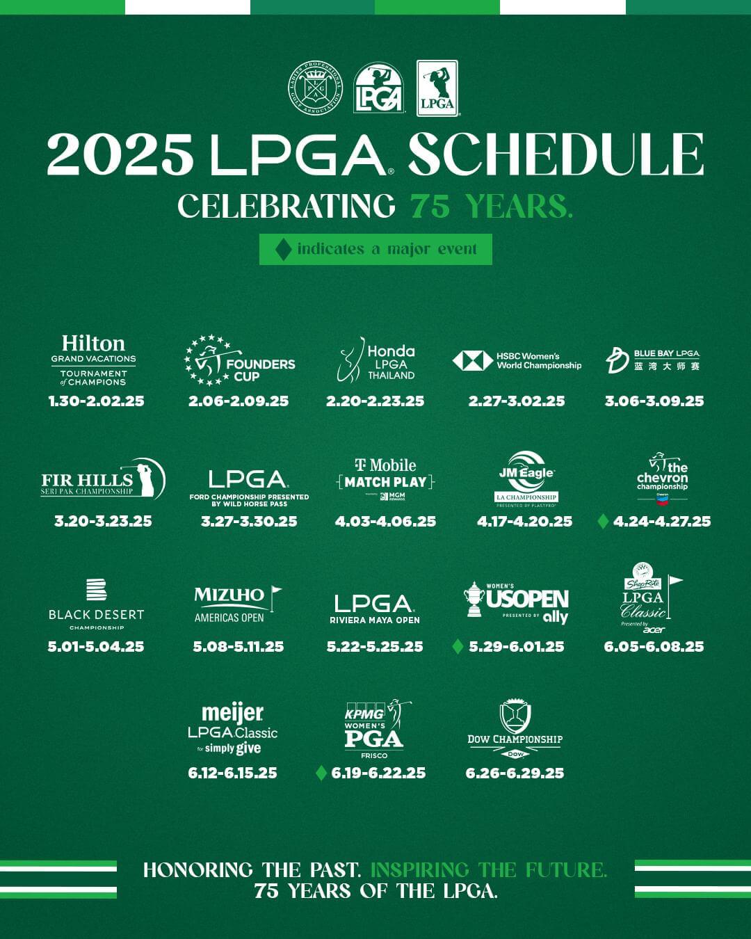 สำหรับรายการเมเจอร์ ในปี 2025 จะเป็นฤดูกาลที่น่าตื่นเต้น โดยนักกีฬาจะแข่งขันชิงเงินรางวัลมากกว่า 47 ล้านดอลลาร์ และไปในสถานที่จะดการแข่งขันใหม่ 3 แห่ง เงินรางวัลรวมของรายการเมเจอร์สูงที่สุดในประวัติศาสตร์ 75 ปีของทัวร์ และเพิ่มขึ้นกว่า 140 เปอร์เซ็นต์ ตั้งแต่ปี 2021 เป็นต้นมา โดยรายการเมเจอร์จะเริ่มต้นในเดือนเมษายน ในการแข่งขัน รายการ เดอะ เชฟรอน แชมเปียนชิพ ที่เดอะ วูดแลนด์ส ในรัฐเท็กซัส จากน้ัน ปลายเดือนพฤษภาคมถึงต้นเดือนมิถุนายน จะแข่งขันที่เอริน ฮิลล์ส รัฐวิสคอนซิน ในรายการ ยูเอส วีเมนส์ โอเพ่น เป็นครั้งแรกของการแข่งขันที่มาที่เอริน ฮิล์ส และอีกสามสัปดาห์ต่อมา ทัวร์จะไปเยือนบ้านเกิดของ พีจีเอ ออฟ อเมริกา ในการแข่งขันรายการ เคพีเอ็มจี วีเมนส์ พีจีเอ แชมเปียนชิพ ที่ฟิลด์ส แรนช์ อีสต์ ในฟริสโก รัฐเท็กซัส และข้ามไปยุโรป ประเดิมด้วยรายการ เอวิยอง แชมเปียนชิพ ที่เอวิยอง รีสอร์ท กอล์ฟ คลับ ประเทศฝรั่งเศส เป็นรายการแรกเริ่มต้นยูโรเปียน สวิง ในเดือนกรกฎาคม และรายการเอไอจี วีเมนส์ โอเพ่น ที่เวลส์ ในเดือนสิงหาคมเป็นอีกหนึ่งสนามใหม่ในทัวร์