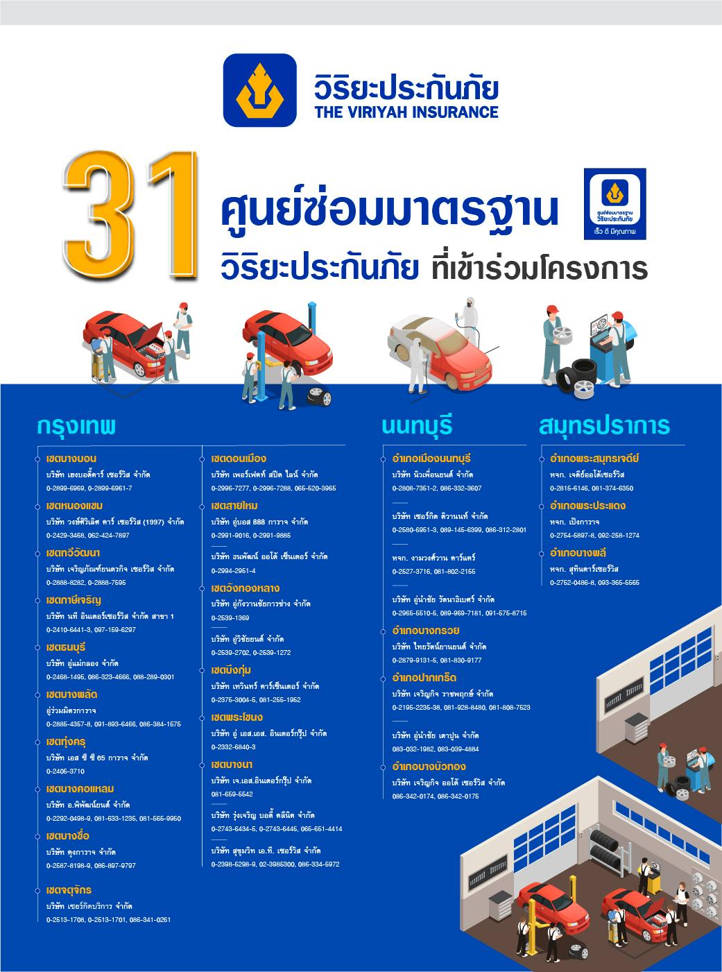 สำหรับศูนย์ซ่อมมาตรฐานวิริยะประกันภัยที่เข้าร่วมโครงการให้บริการตรวจรถฟรี จำนวน 31 แห่ง ได้แก่ 1) บริษัท เฮงบอดี้คาร์ เซอร์วิส จำกัด 2) บริษัท วงษ์ศิริเลิศ คาร์ เซอร์วิส (1997) จำกัด 3) บริษัท เจริญภัภัณฑ์ยนตรกิจ เซอร์วิส จำกัด 4) บริษัท นที อินเตอร์เซอร์วิส จำกัด สาขา 1 5) บริษัท อู่แม่กลอง จำกัด 6) อู่ร่วมมิตรการาจ 7) บริษัท เอส ซี ซี 65 การาจ จำกัด 8) บริษัท อ.พิพัฒน์ยนต์ (1989) จำกัด 9) บริษัท คุงการาจ จำกัด 10) บริษัท เซอร์กิตบริการ จำกัด 11) บริษัท เพอร์เฟคท์ สปีด ไลน์ จำกัด 12) บริษัท อู่บอส 888 การาจ จำกัด 13) บริษัท ธนพัฒน์ ออโต้ เซ็นเตอร์ จำกัด 14) บริษัท อู่กังวานชัยการช่าง จำกัด 15) บริษัท อู่วิชัยยนต์ จำกัด 16) บริษัท เทวินทร์ คาร์เซ็นเตอร์ จำกัด 17) บริษัท อู่ เอส.เอส. อินเตอร์กรุ๊ป จำกัด 18) บริษัท เจ.เอส.อินเตอร์ กรุ๊ป จำกัด 19) บริษัท รุ่งเจริญ บอดี้ คลีนิก จำกัด 20) บริษัท สุขุมวิท เอ.ที. เซอร์วิส จำกัด 21) บริษัท นิวเพื่อนยนต์ จำกัด 22) บริษัท เซอร์กิต ติวานนท์ จำกัด 23) หจก. งามวงศ์วาน คาร์แคร์ 24) บริษัท อู่นำชัย รัตนาธิเบศร์ จำกัด 25) บริษัท ไทยรัตน์ยานยนต์ จำกัด 26) บริษัท เจริญกิจ ราชพฤกษ์ จำกัด 27) บริษัท อู่นำชัย เตาปูน จำกัด 28) บริษัท เจริญกิจ ออโต้ เซอร์วิส จำกัด 29) หจก. เจดีย์ออโต้เซอร์วิส 30) หจก. เป้งการาจ 31) หจก. สุทินคาร์เซอร์วิส
