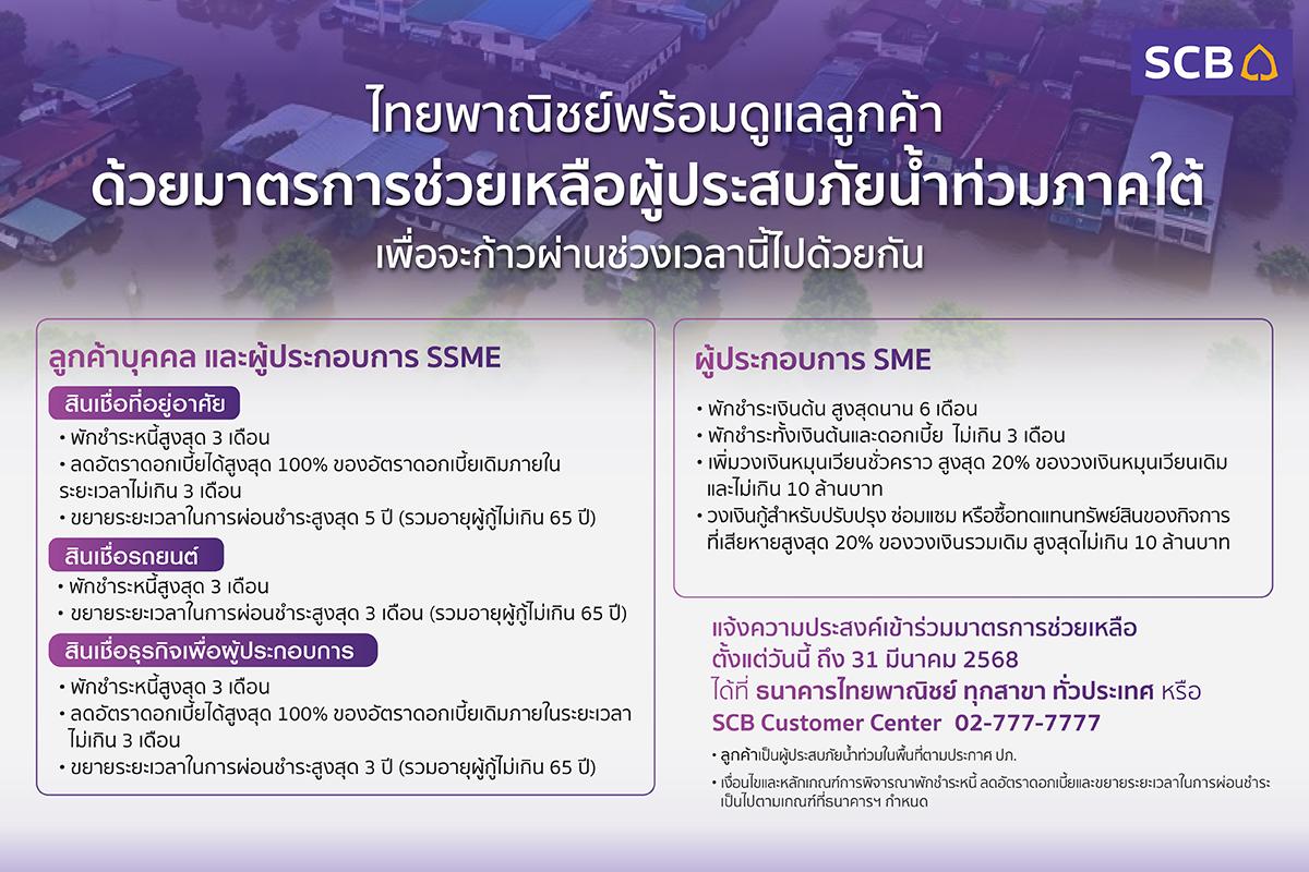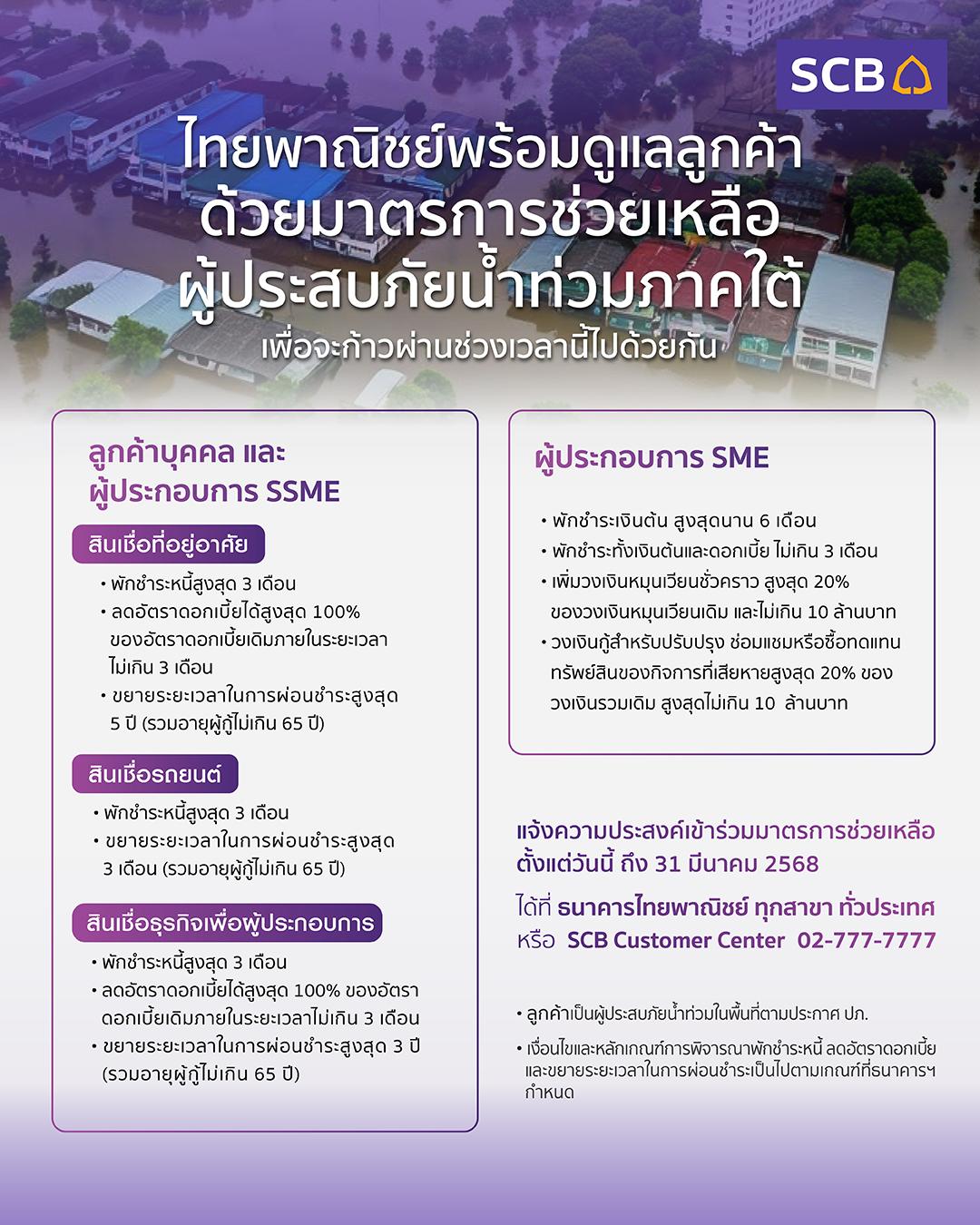 ธนาคารไทยพาณิชย์ออกมาตรการช่วยเหลือเร่งด่วนแก่ลูกค้ารายย่อยและผู้ประกอบการธุรกิจที่ได้รับผลกระทบจากสถานการณ์น้ำท่วมภาคใต้ โดยให้ลูกค้ายื่นขอพักชำระหนี้ ลดดอกเบี้ย เพิ่มวงเงินพิเศษเพื่อเสริมสภาพคล่อง ครอบคลุมลูกค้า 3 กลุ่มหลัก ประกอบด้วย ลูกค้าบุคคล ลูกค้าธุรกิจ และลูกค้าผู้ประกอบการเอสเอ็มอี โดยมาตรการให้ความช่วยเหลือ ดังนี้