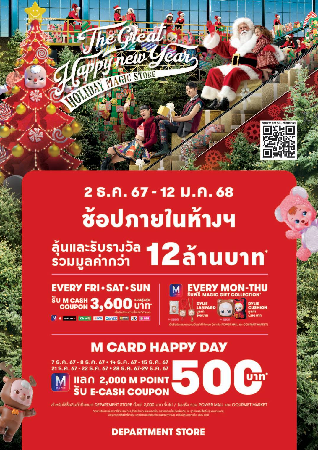 เพื่อเร่งกระตุ้นการใช้จ่าย ได้เพิ่มแคมเปญ THE GREAT HAPPY NEW YEAR 2025 : HOLIDAY MAGIC STORE ตั้งแต่วันที่ 2 ธันวาคม นี้ ถึง 12 มกราคม 2568 โดยนอกเหนือจากการช้อปปิ้งสินค้าลดราคาพิเศษแล้ว สมาชิก M Card เมื่อช้อปภายในห้างฯ และศูนย์ฯเดอะมอลล์ไลฟ์สโตร์, เดอะมอลล์ โคราช, เอ็มโพเรียม, เอ็มควอเทียร์, เอ็มสเฟียร์ และพารากอน ดีพาร์ทเม้นท์สโตร์ ยังสามารถลงทะเบียนรับสิทธิ์ร่วมลุ้นรางวัลใหญ่มูลค่ามากกว่า 2 ล้านบาท ได้แก่ รถยนต์โตโยต้า ออล-นิว แคมรี่ รุ่น 2.5 เฮท อี วี พรีเมียม ลักซ์ชัวรี (Toyota ALL-NEW CAMRY 2.5 HEV PREMIUM LUXURY) หรือร่วมลุ้นตั๋วเครื่องบินไป-กลับ กรุงเทพฯ-ญี่ปุ่น สายการบินเจแปนแอร์ไลน์ รางวัลละ 2 ที่นั่ง 2 รางวัล เมื่อช้อปครบทุก 2,000 บาท รับ 1 สิทธิ์ พิเศษเมื่อชำระผ่านบัตรเครดิต BANGKOK BANK M VISA รับสิทธิ์ลุ้นชิงโชค 3 สิทธิ์ และ ชำระผ่านบัตรเครดิต UOB, บัตรเครดิต ttb, บัตรเครดิตอิออน, เมืองไทยสไมล์คลับ รับสิทธิ์ลุ้นชิงโชค 2 สิทธิ์