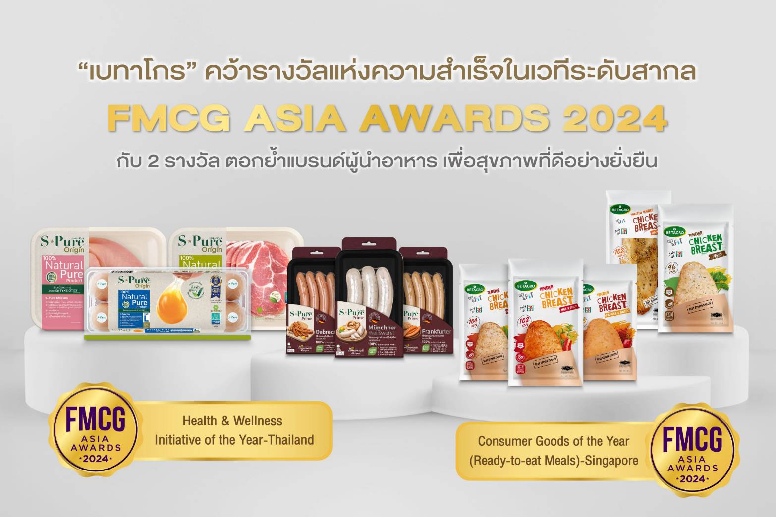 ทั้งนี้แบรนด์ “S-Pure” คว้ารางวัลอันทรงเกียรติ Health & Wellness Initiative of the Year – Thailand ในกลุ่มผลิตภัณฑ์เนื้อหมู ไก่ ไข่ และอาหารพร้อมทาน สะท้อนถึงความมุ่งมั่นในการส่งมอบอาหารที่มีคุณภาพและความปลอดภัยสูงสุดที่ผ่านกระบวนการเลี้ยงแบบธรรมชาติ 100% (100% Natural Pure Product) และเป็นอาหารฉลากสะอาด (Clean Label) ที่ปราศจากการแต่งเติม ทั้งไนเตรต และไนไตรท์ ไม่แต่งสี หรือกลิ่นสังเคราะห์ และปราศจากสารกันเสีย ตอบโจทย์ผู้บริโภคยุคใหม่ที่รักสุขภาพ ส่วนแบรนด์ Betagro ผลิตภัณฑ์อกไก่พร้อมทาน ได้รับรางวัล Consumer Goods of the Year (Ready-to-eat Meals) – Singapore โดยเป็นผลิตภัณฑ์ที่ได้รับการยกย่องว่าเป็นสินค้าที่ผู้บริโภคเลือกซื้อและมีการเติบโตอย่างต่อเนื่อง
