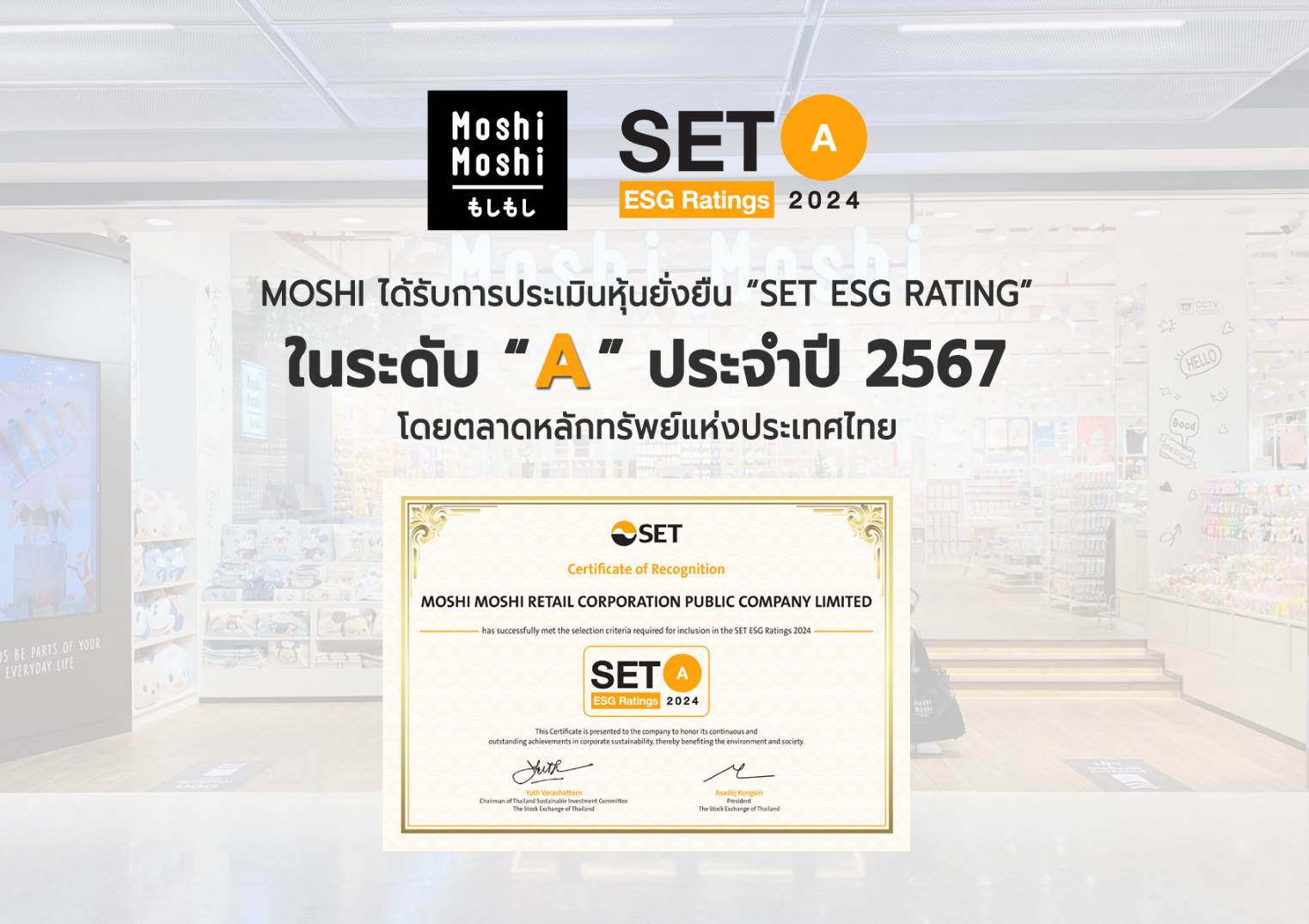 'บมจ. โมชิ โมชิ รีเทล คอร์ปอเรชั่น’ หรือ MOSHI ก้าวสู่มาตรฐานความยั่งยืน ติดอันดับการประเมินหุ้นยั่งยืนSET ESG Ratings ปี 2567 ระดับ ‘A’ สะท้อนความสำเร็จในการดำเนินธุรกิจ หลังจากเข้าจดทะเบียนในตลาดหลักทรัพย์ฯ ในปี 2565 ตอกย้ำมาตรฐานการกำกับดูแลกิจการที่ดี พัฒนาองค์กรสู่การเติบโตอย่างยั่งยืน เดินหน้ามุ่งมั่นยกระดับการดำเนินงานผ่านการเข้าร่วมโครงการพัฒนาข้อมูลด้านความยั่งยืนของตลาดหลักทรัพย์ฯ พร้อมดำเนินโครงการด้านสิ่งแวดล้อมและการพัฒนาสังคม
