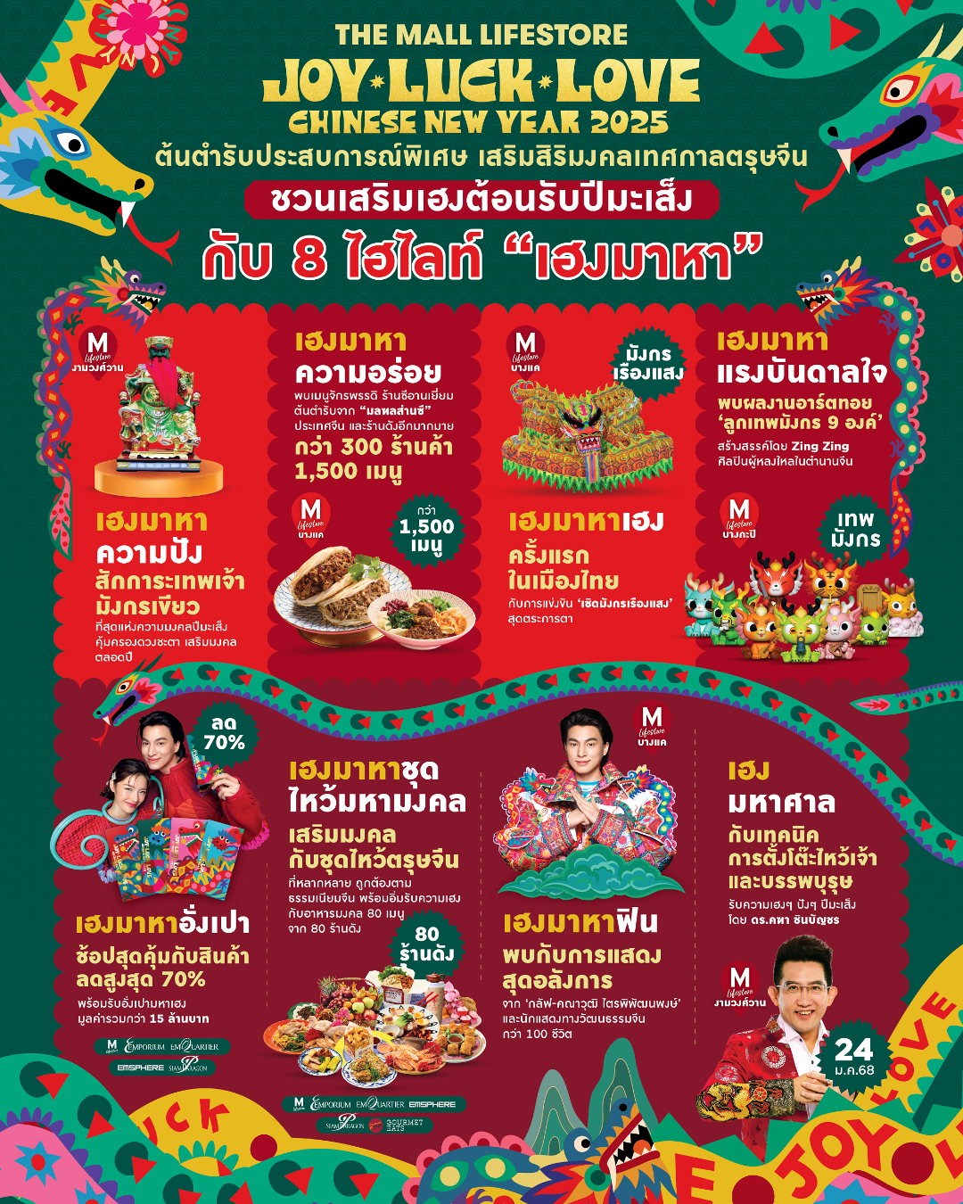 • ปักหมุดรับ 8 ความ ‘เฮง’ ทุกวันสำคัญของเทศกาล จ่าย -ไหว้- เที่ยว เสริมมงคลครบทุกมิติ ทุกมุมเมืองที่ เดอะมอลล์ ไลฟ์สโตร์ JOY LUCK LOVE CHINESE NEW YEAR 2025 : ปีมะเส็งเฮงมาหา ระหว่าง 13 ม.ค. – 17 ก.พ. 68 และห้างสรรพสินค้า เอ็มโพเรียม, เอ็มสเฟียร์, พารากอน ดีพาร์ทเม้นท์สโตร์ และกูร์เมต์ มาร์เก็ต