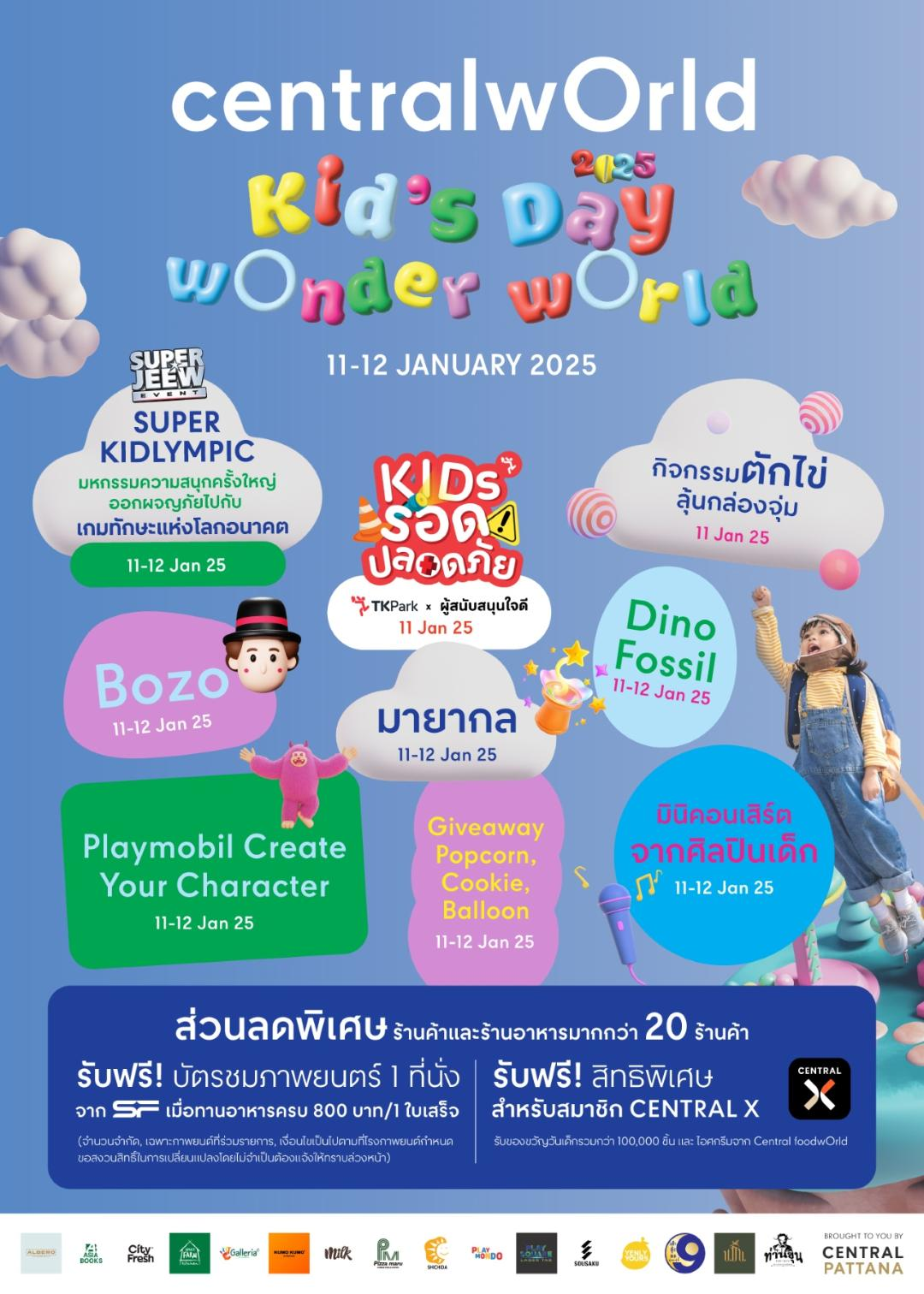 พิเศษ! สมาชิกแอปพลิเคชัน Central X รับฟรี! ของขวัญวันเด็กกว่า 100,000 ชิ้น (จำกัด 1 สิทธิ์/ท่าน/วัน) รับฟรี! ไอศกรีม จาก Central foodwOrld, เมื่อทานอาหารภายในศูนย์การค้าฯ ครบ 800.- ขึ้นไป รับฟรี! บัตรชมภาพยนตร์ 1 ที่นั่ง จำนวน 2 ใบ* จากโรงภาพยนตร์ SF Cinema (เงื่อนไขเป็นไปตามที่กำหนด) พร้อมโปรโมชั่นและกิจกรรมสุดพิเศษจากแบรนด์ชั้นนำ อาทิ อุทยานการเรียนรู้ TK Park เปิดพื้นที่ชวนเด็กๆ มา "Kids รอด ปลอดภัย" เตรียมตัว รู้ รอด จากอุบัติเหตุ ภัยพิบัติ เหตุการณ์ไม่คาดฝัน ที่อาจเกิดขึ้นได้ทุกเมื่อ ไม่ว่าจะเจอสถานการณ์หนักแค่ไหนก็พร้อมรับมือ เอาตัวรอดได้อย่างปลอดภัย สนุกกับกิจกรรมพร้อมรับรางวัลพิเศษมากมาย และเพลิดเพลินกับการแสดงสุดพิเศษ วันเสาร์ที่ 11 มกราคม 2568 เวลา 10.00-17.00 น. ณ อุทยานการเรียนรู้ TK Park ชั้น 8 ศูนย์การค้าเซ็นทรัลเวิลด์ (น้องๆ ที่มีอายุไม่เกิน 14 ปี พร้อมผู้ปกครอง 1 ท่าน เข้าฟรี!), Hit Galleria ที่ลาน centralcOurt สนุก Workshop งาน Art & Craft ปลดปล่อยจินตนาการไปด้วยกันที่บูธกิจกรรมสุดครีเอทีฟ, Playmodo ที่ลาน centralcOurt ชวนถ่ายรูปสุดพิเศษกับ Photo Backdrop Dodo and friends พิเศษ! เพียงโพสต์รูป รับฟรีพวงกุญแจและสติ๊กเกอร์ Dodo and Friends และชมโชว์ Mascot Dodo พร้อมแจกสติ๊กเกอร์ Dodo and friends ขนมสายไหม และลูกโป่ง, ชมการแสดงดนตรีจาก Yamaha Music School และโปรโมชั่นจากร้านค้าแบรนด์งดัง อาทิ Albero, Asia Books, B-Smart, Ginger Farm KOI Thé, Kumo Kumo Cheese, Pizza Maru, Sousaku, YenlyYours Dessert และอีกมากมาย