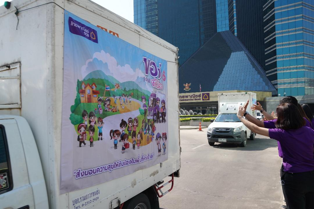 นอกจากจัดเตรียมของขวัญแล้ว ผู้บริหารและพนักงานกลุ่มเอสซีบี เอกซ์ ยังได้ร่วมเขียนการ์ดอวยพรขนาดใหญ่ลำเลียงของขวัญขึ้นรถและปล่อยขบวนรถของขวัญไปยังสาขาของธนาคารไทยพาณิชย์ในจังหวัดต่างๆ ซึ่งพี่ๆ ที่สาขาจะเป็นตัวแทนเดินทางไปส่งมอบกล่องของขวัญจนถึงมือน้องๆ ที่โรงเรียนเพื่อเติมเต็มความสุขและเป็นกำลังใจในการศึกษาเล่าเรียน ให้เติบโตมาเป็นคนดีและคนเก่งของประเทศชาติต่อไป