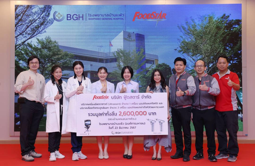 คุณจันทรา พงศ์ศรี กรรมการผู้จัดการ บริษัท ฟู้ดสตาร์ จำกัด นำทีมผู้บริหารและพนักงาน บริษัทฯ มอบเครื่องมือและอุปกรณ์ทางการแพทย์ให้แก่ โรงพยาบาลบ้านแพ้ว โดยจัดซื้อเครื่องมือ