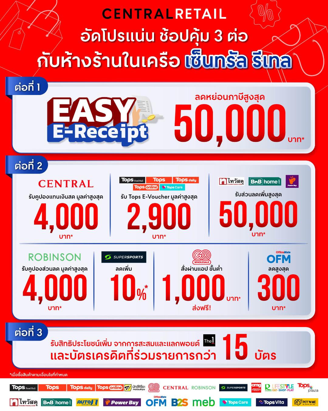 สำหรับการเข้าร่วมโครงการ Easy E-Receipt ในปี 2568 เซ็นทรัล รีเทล และห้างร้านในเครือ พร้อมให้บริการและอำนวยความสะดวกในการดำเนินการเหมือนเช่นเคย เมื่อซื้อสินค้าทั้งรูปแบบออฟไลน์และออนไลน์ ตั้งแต่วันที่ 16 มกราคม – 28 กุมภาพันธ์ 2568 สามารถนำไปลดหย่อนภาษีเงินได้บุคคลธรรมดา สูงสุด 50,000 บาท โดยลูกค้าจะต้องขอใบกำกับภาษีแบบเต็มรูปแบบอิเล็กทรอนิกส์ (e-Tax Invoice) ตามมาตรการของรัฐ เพียงแค่ยื่นใบเสร็จและบัตรประชาชนที่จุดบริการลูกค้า โดยสามารถลดหย่อนภาษีได้ ดังนี้