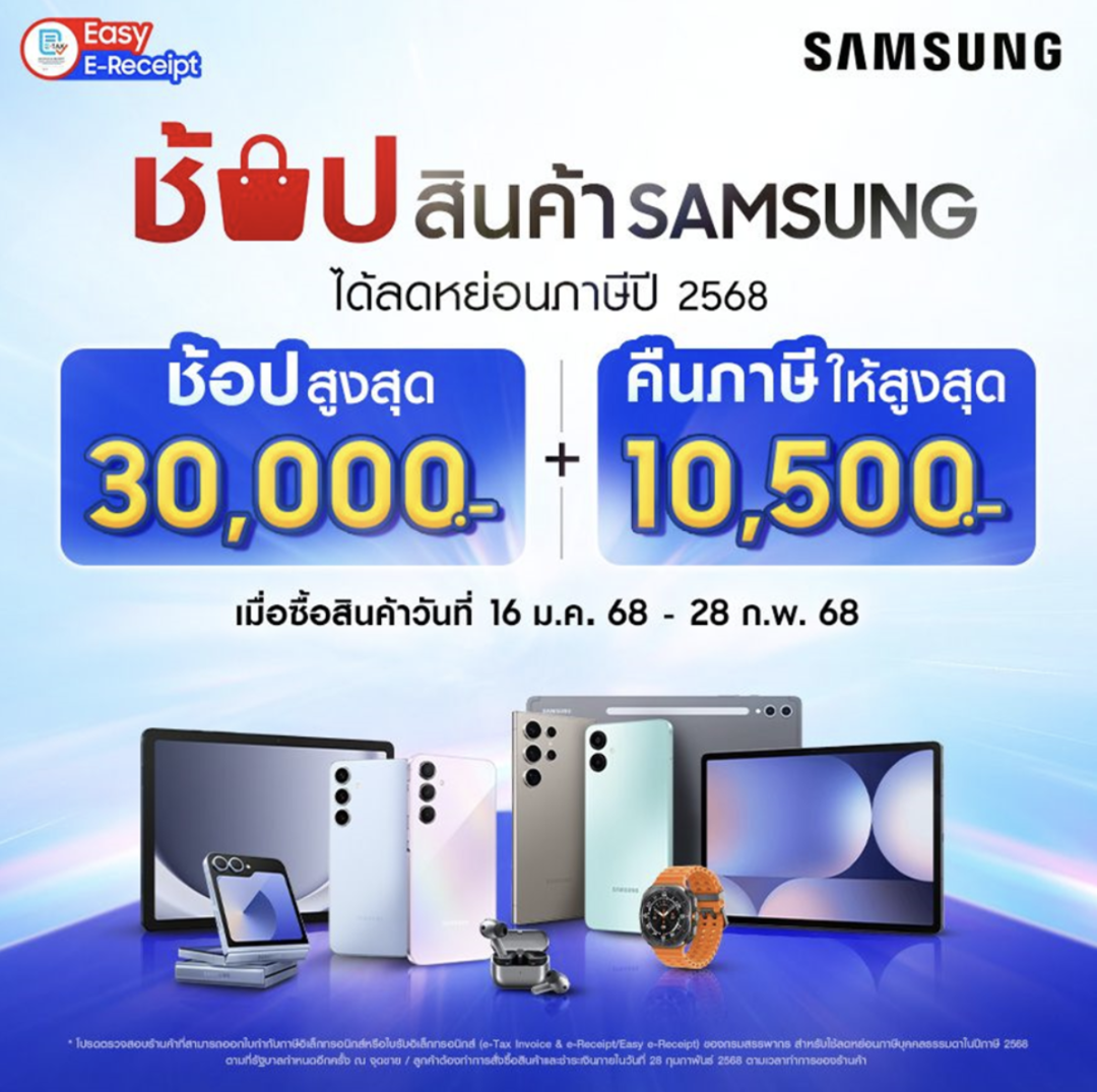 ซัมซุง หนุนคนไทยช้อปลดหย่อนภาษีปี 2568 ในโครงการ Easy E-Receipt 2.0 มอบส่วนลดช้อปสินค้าซัมซุงหลายรายการ รับสิทธิ์ลดหย่อนภาษีสูงสุดถึง 10,500 บาท เมื่อช้อปสินค้าซัมซุงมูลค่าสูงสุด 30,000 บาท เริ่ม 16 ม.ค. ถึง 28 ก.พ. 68