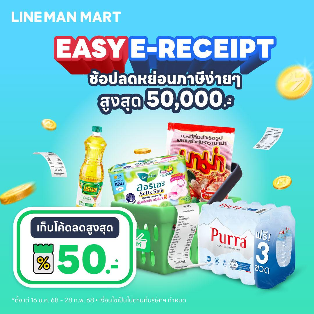 เปิดศักราชใหม่รับปีงู LINE MAN MART ชวนคนไทยช้อปสินค้าออนไลน์ รับสิทธิลดหย่อนภาษีในโครงการ Easy E-Receipt 2.0 ใช้สะดวก สั่งง่าย พร้อมรับใบกำกับภาษีเต็มรูปแบบ เพื่อนำไปใช้ลดหย่อนภาษีเงินได้บุคคลธรรมดาประจำปี 2568 สูงสุดถึง 50,000 บาท เพียงสั่งสินค้าจากร้านค้าที่ร่วมรายการกว่า 1,716 แห่ง บน LINE MAN MART พร้อมแจกส่วนลดเพิ่ม 20% ใช้ได้ทั้งลูกค้าเก่าและลูกค้าใหม่ เริ่มวันที่ 16 มกราคม ถึง 28 กุมภาพันธ์ 2568