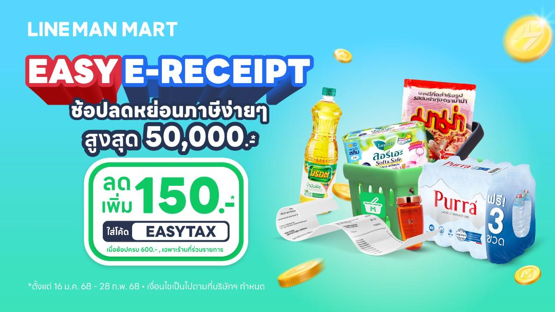 โครงการ Easy E-Receipt 2.0 บน LINE MAN MART เป็นการต่อยอดกระแสตอบรับที่ดีจากปีที่ผ่านมา ช่วยอำนวยความสะดวกให้ผู้ใช้ไม่พลาดโอกาสใช้สิทธิลดหย่อนภาษี นอกจากนี้ LINE MAN ยังมอบส่วนลดพิเศษให้กับทุกคนเพียงกรอกโค้ด EASYTAX รับส่วนลดเพิ่มทันที! สูงสุด 20% ใช้ได้ทั้งลูกค้าเก่าและลูกค้าใหม่ เมื่อสั่งขั้นต่ำ 600 บาท เริ่มวันที่ 16 มกราคม ถึง 28 กุมภาพันธ์ 2568