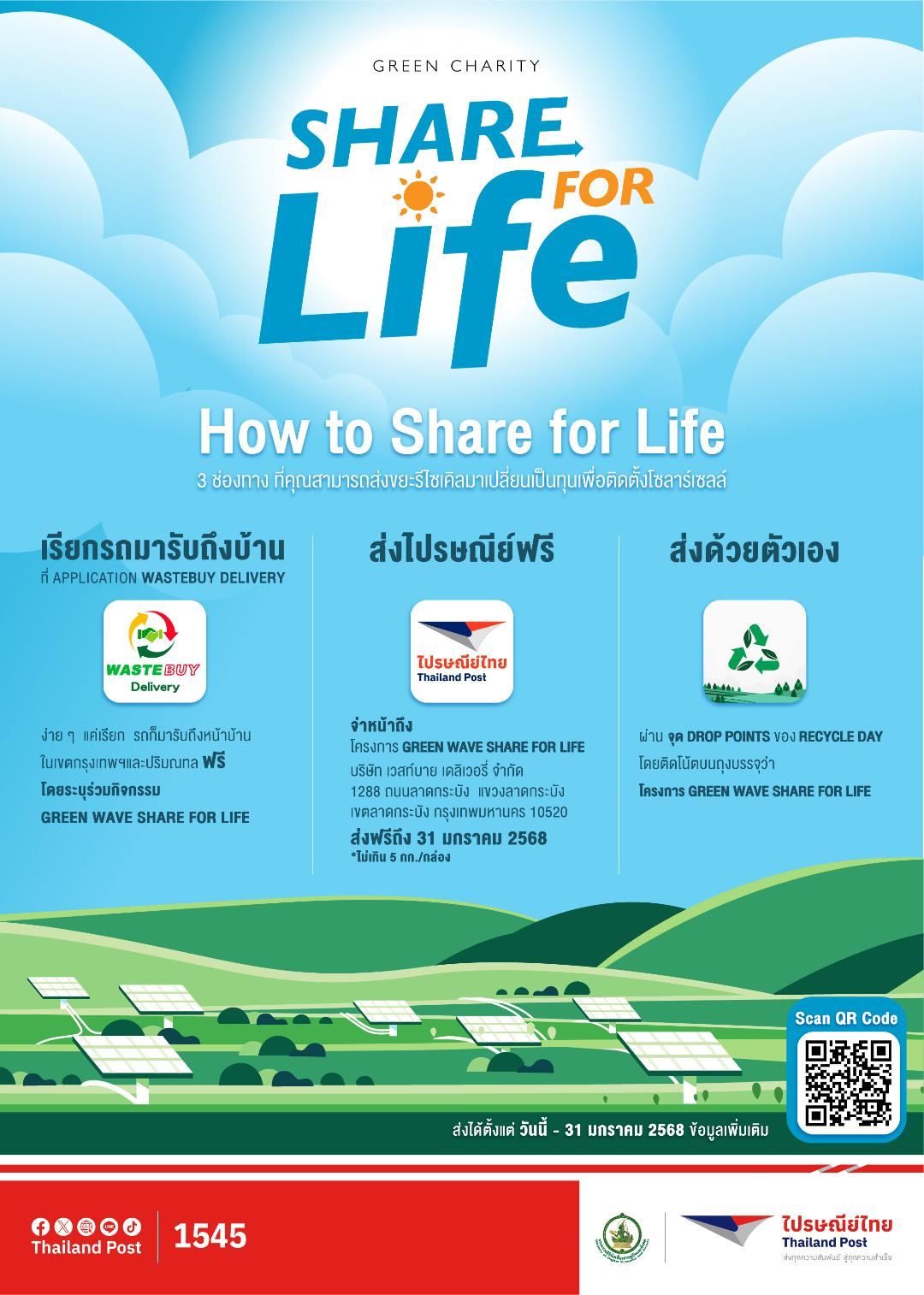 กรุงเทพฯ 16 มกราคม 2568 – บริษัท ไปรษณีย์ไทย จำกัด ร่วมกับ คลื่นกรีนเวฟ พร้อมพันธมิตร ได้แก่ กระทรวงสาธารณสุข ชมรมแพทย์ชนบท Less Plastic Thailand , Recycle Day และ Wastebuy Delivery เปิดรับขยะประเภทกระดาษ แก้ว เหล็ก อะลูมิเนียม ทองแดง ทองเหลือง และพลาสติก เข้าสู่กระบวนการรีไซเคิลในโครงการ Green Charity Share for life เพื่อเปลี่ยนกลุ่มขยะดังกล่าวเป็นทุนในการติดตั้งแผงโซลาร์เซลล์ให้กับโรงพยาบาลบ่อเกลือ จ.น่าน โดยบรรจุใส่กล่องพัสดุที่มีน้ำหนักไม่เกิน 5 กิโลกรัม จ่าหน้ากล่องถึง โครงการ Green Wave Share for life ส่งได้ ณ ไปรษณีย์ทั่วประเทศโดยไม่มีค่าใช้จ่าย